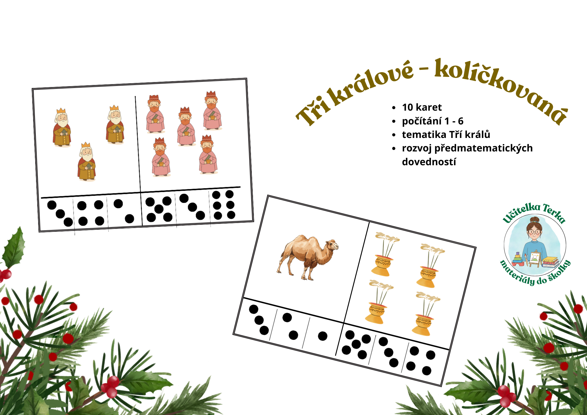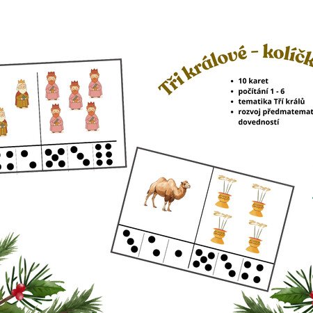 Soubor obsahuje 10 karet s tematikou Tří králů na procvičení předmatematických dovedností a to konkrétně počítání 1-6. Aktivita je ve formátu kolíčkované, kdy děti označují správné hodnoty kolíčky.