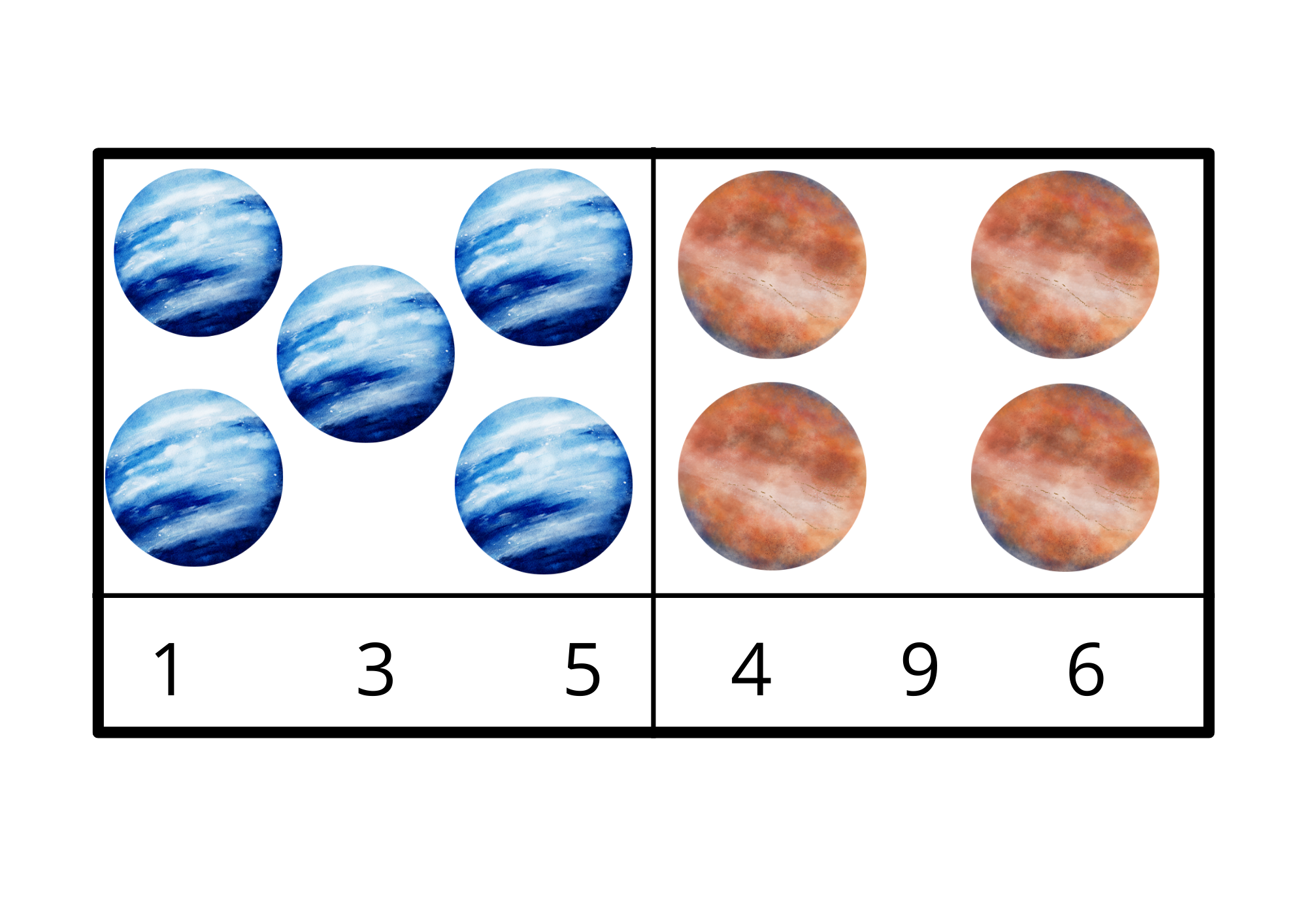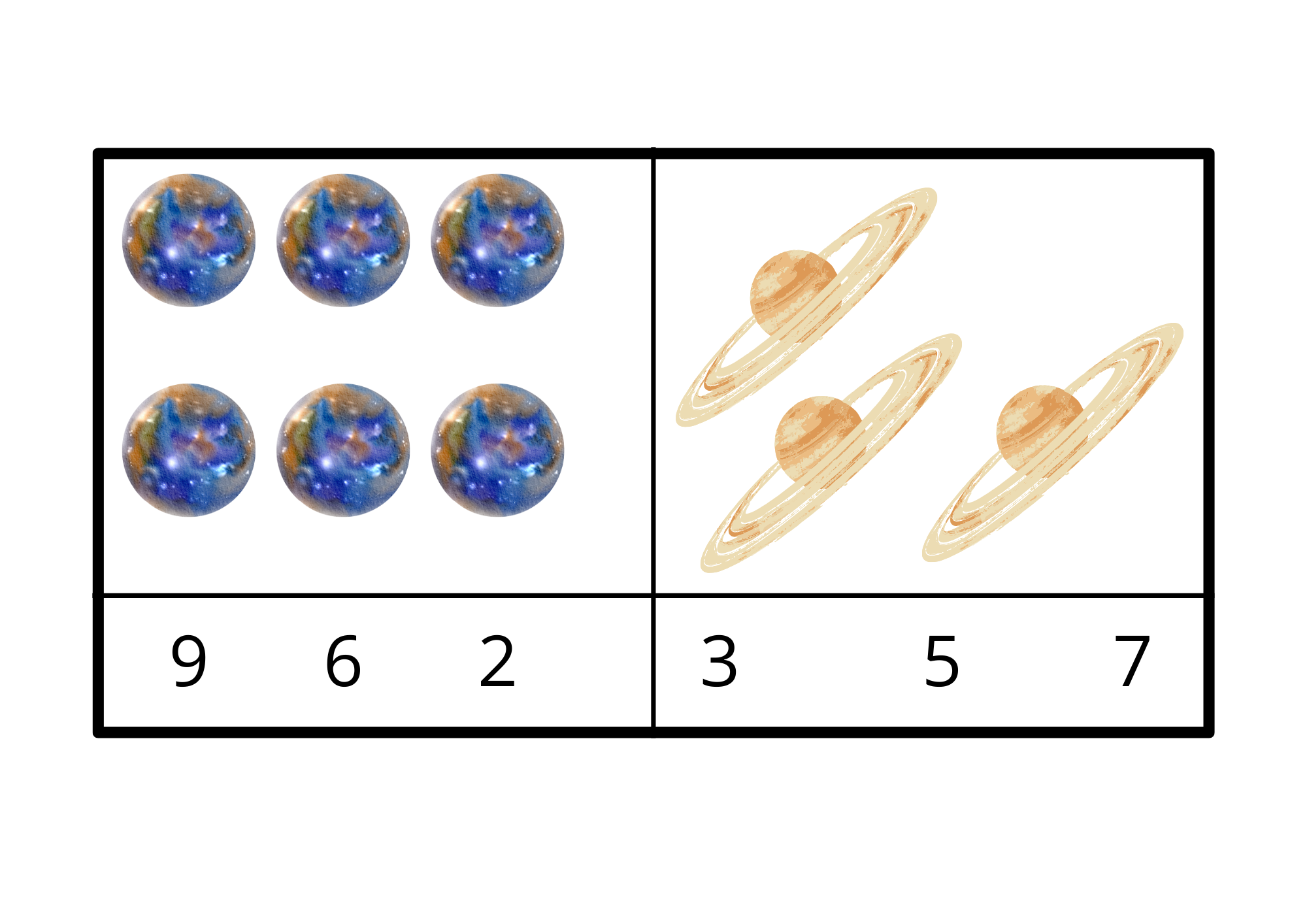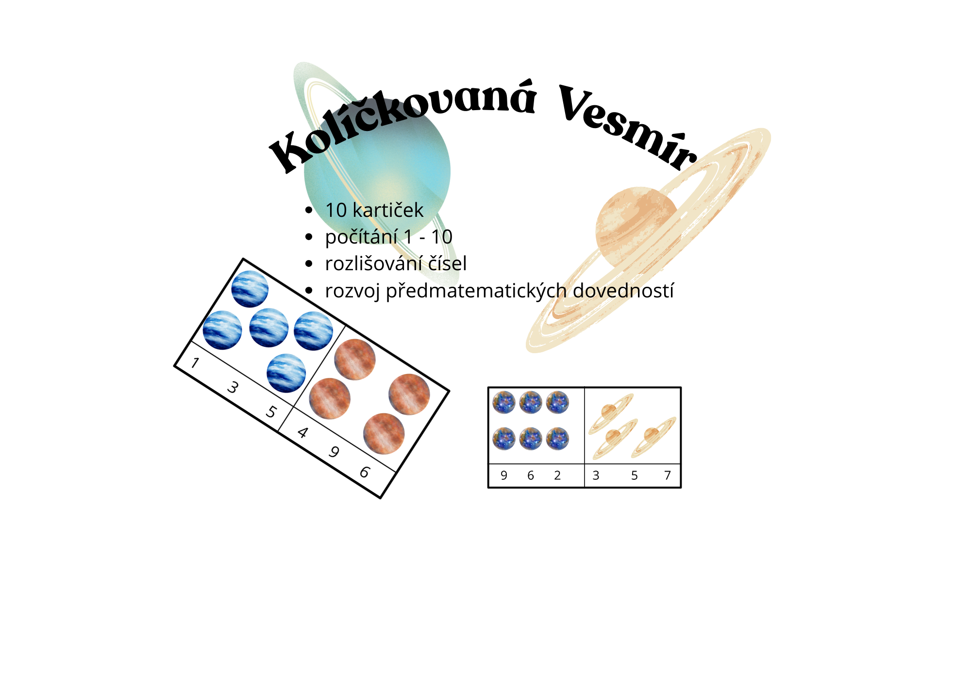 Soubor obsahuje 10 karet s tematikou Vesmíru na procvičení předmatematických dovedností a to konkrétně počítání 1-10.