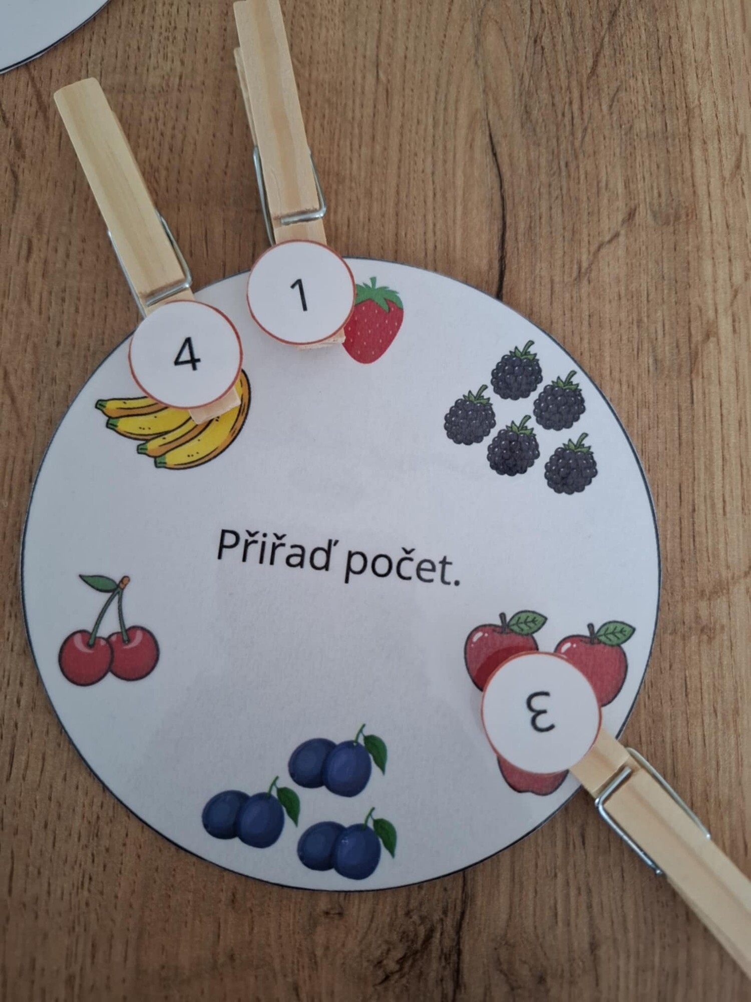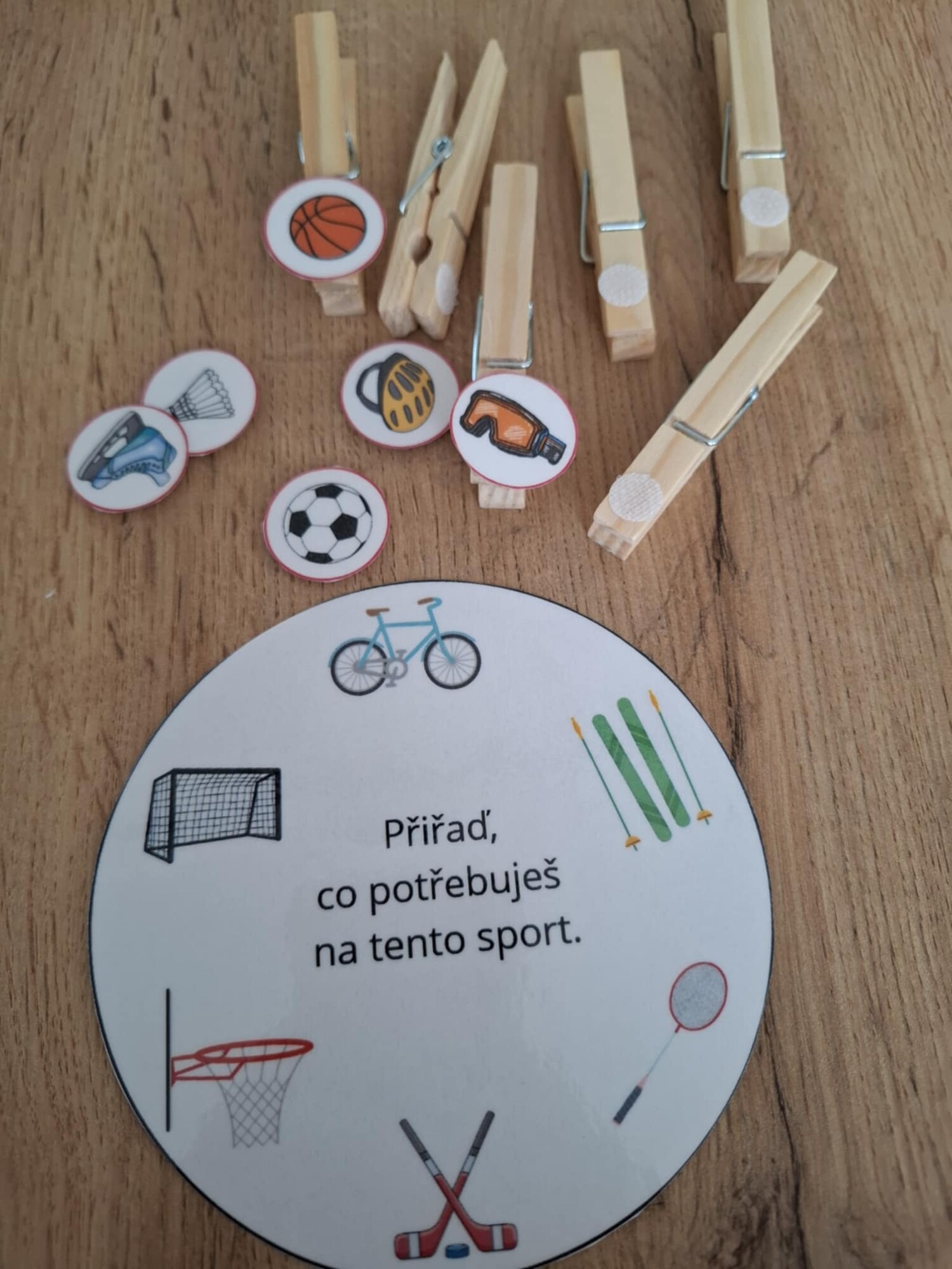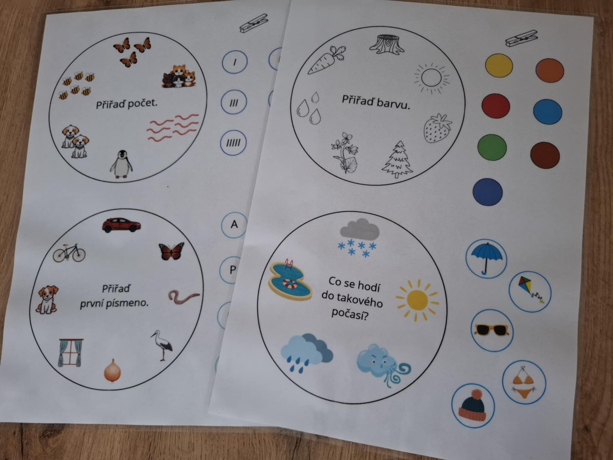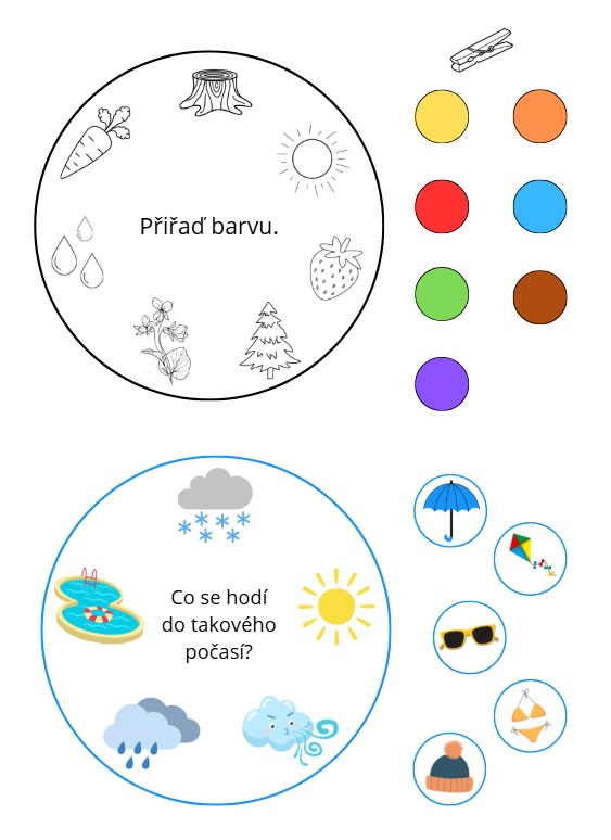 Cílem je přiřadit k obrázkům na kolečku kolíčky se správným řešením.