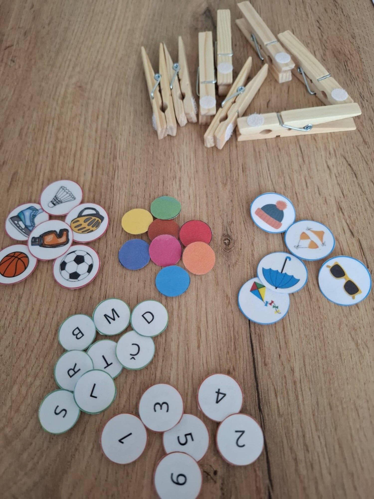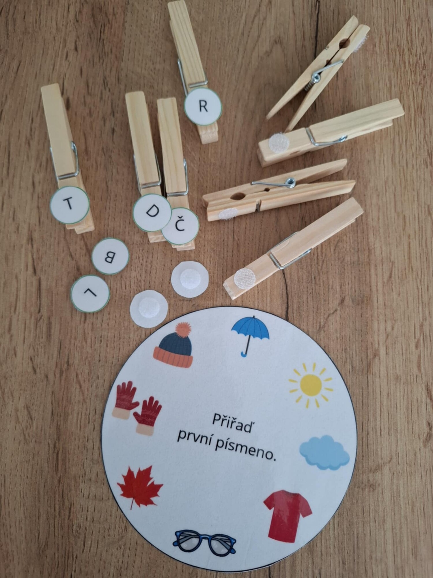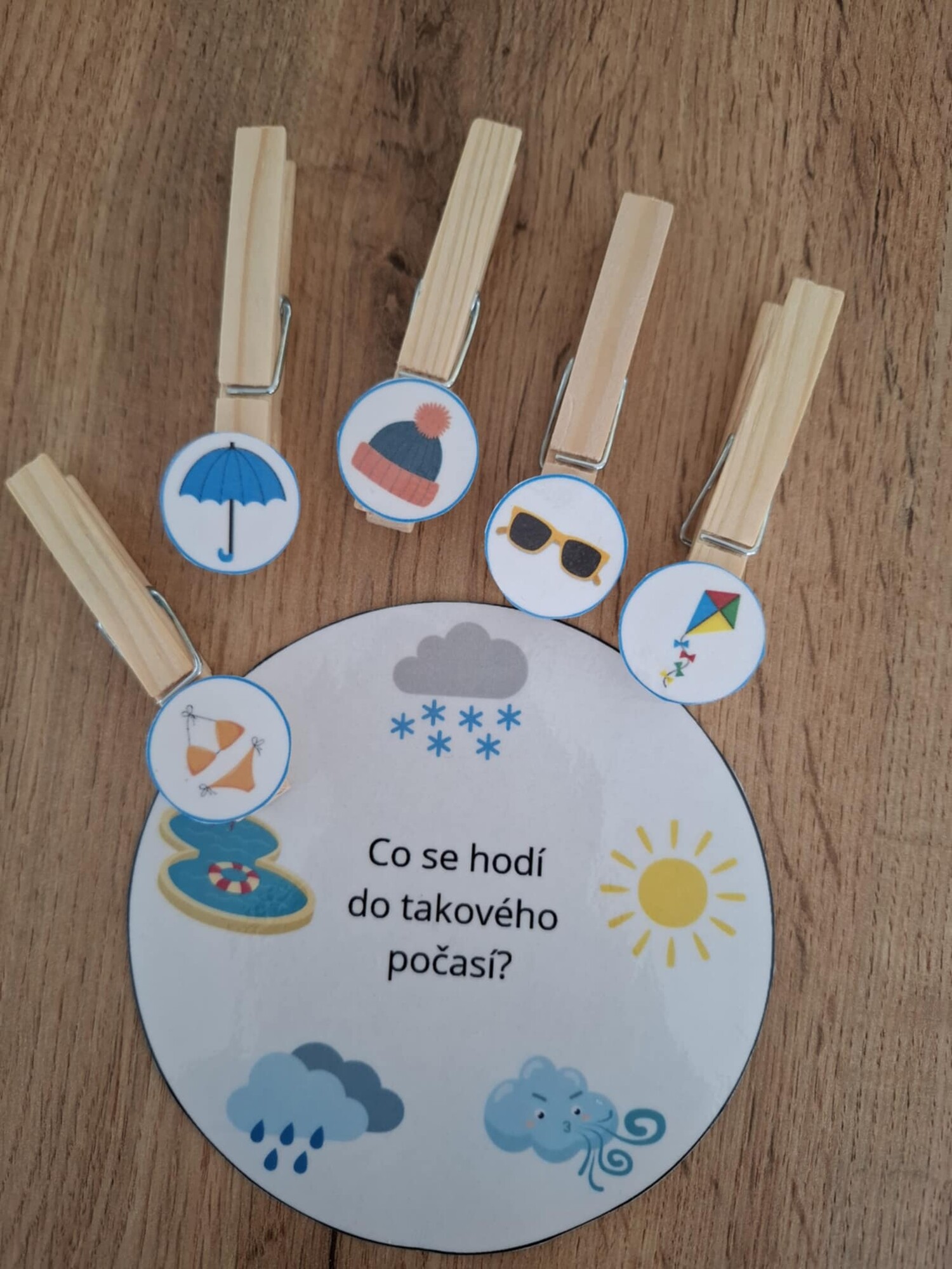 Cílem je přiřadit k obrázkům na kolečku kolíčky se správným řešením.