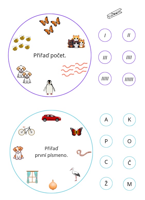 určování počtu a navíc dvě kolečka na určování prvního písmene ve slově.
