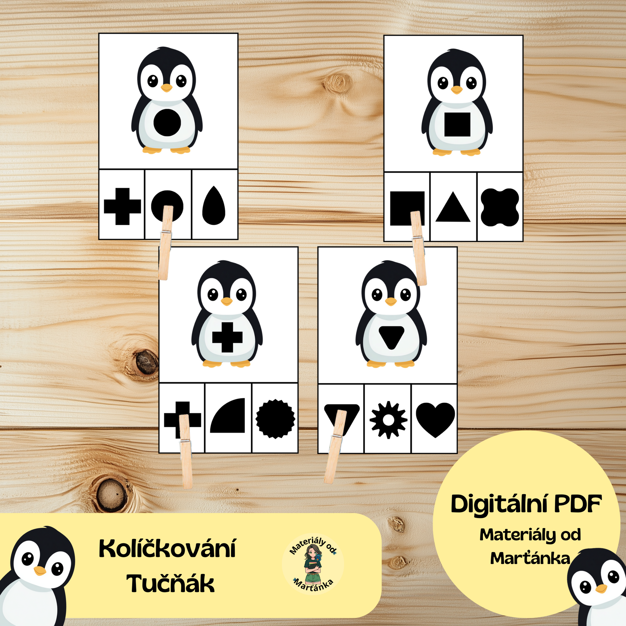 Každý tučňák má na bříšku jeden symbol – úkolem dítěte je najít stejný symbol mezi nabízenými možnostmi a označit ho kolíčkem.