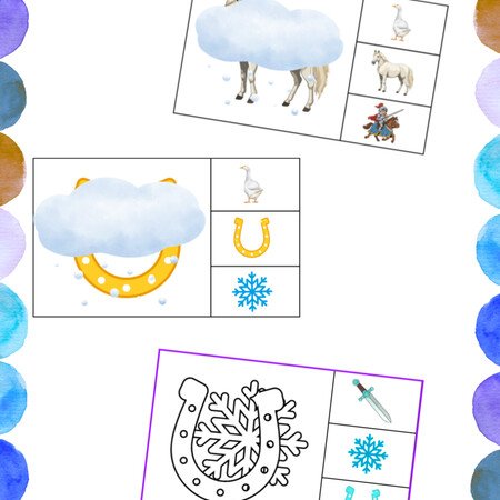 Soubor obsahuje 18 kartiček určených ke kolíčkování. Naleznete zde barevné obrázky překryté mrakem, ale také překrývající se obrysy obrázků.