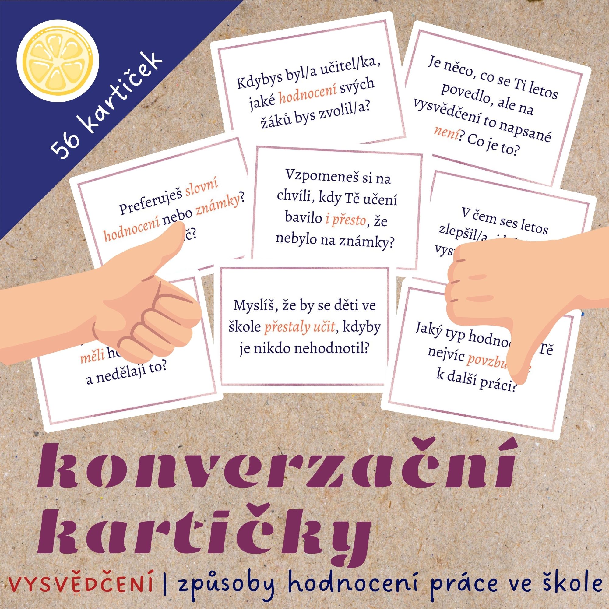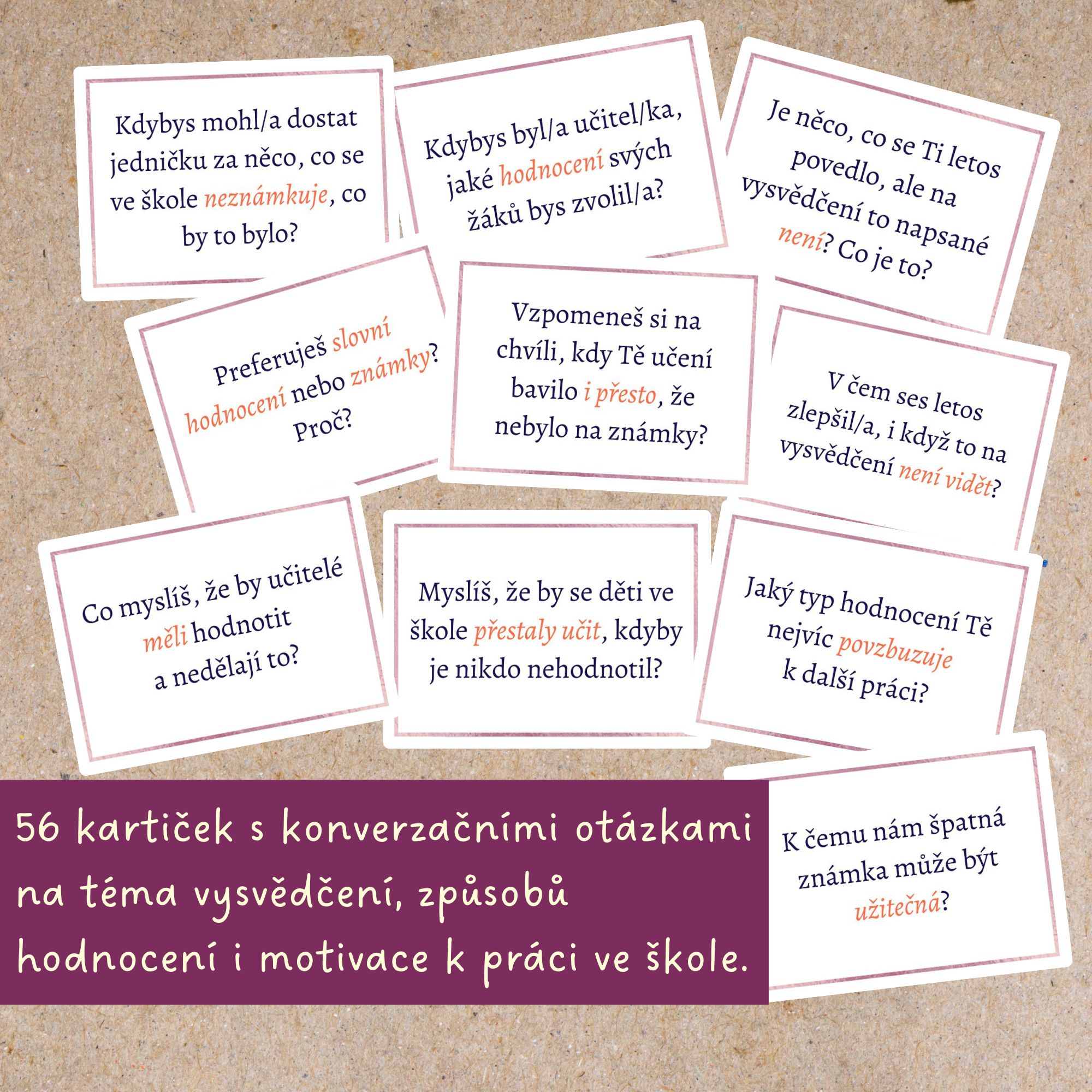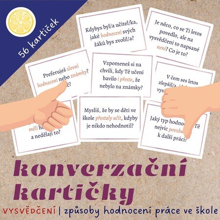 ✏️Způsoby hodnocení školní práce mají své limity a kdy jindy se nad nimi zkusit zamyslet než v období vysvědčení. Soubor konverzačních kartiček vám ve třídě usnadní debatu o tom, zda a proč je hodnocení důležité, jestli preferujeme známky či slovní hodnocení, nebo o tom, co škola na vysvědčení vůbec nehodnotí, ale možná by měla.