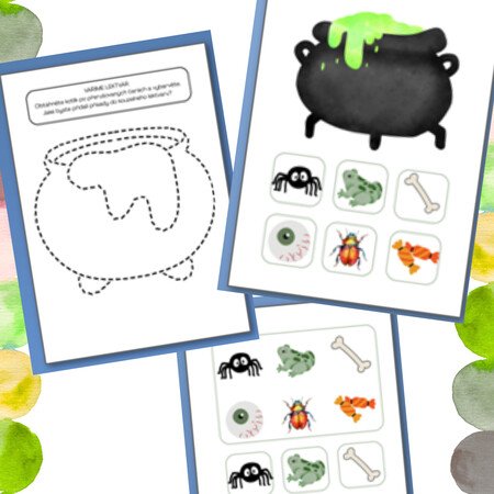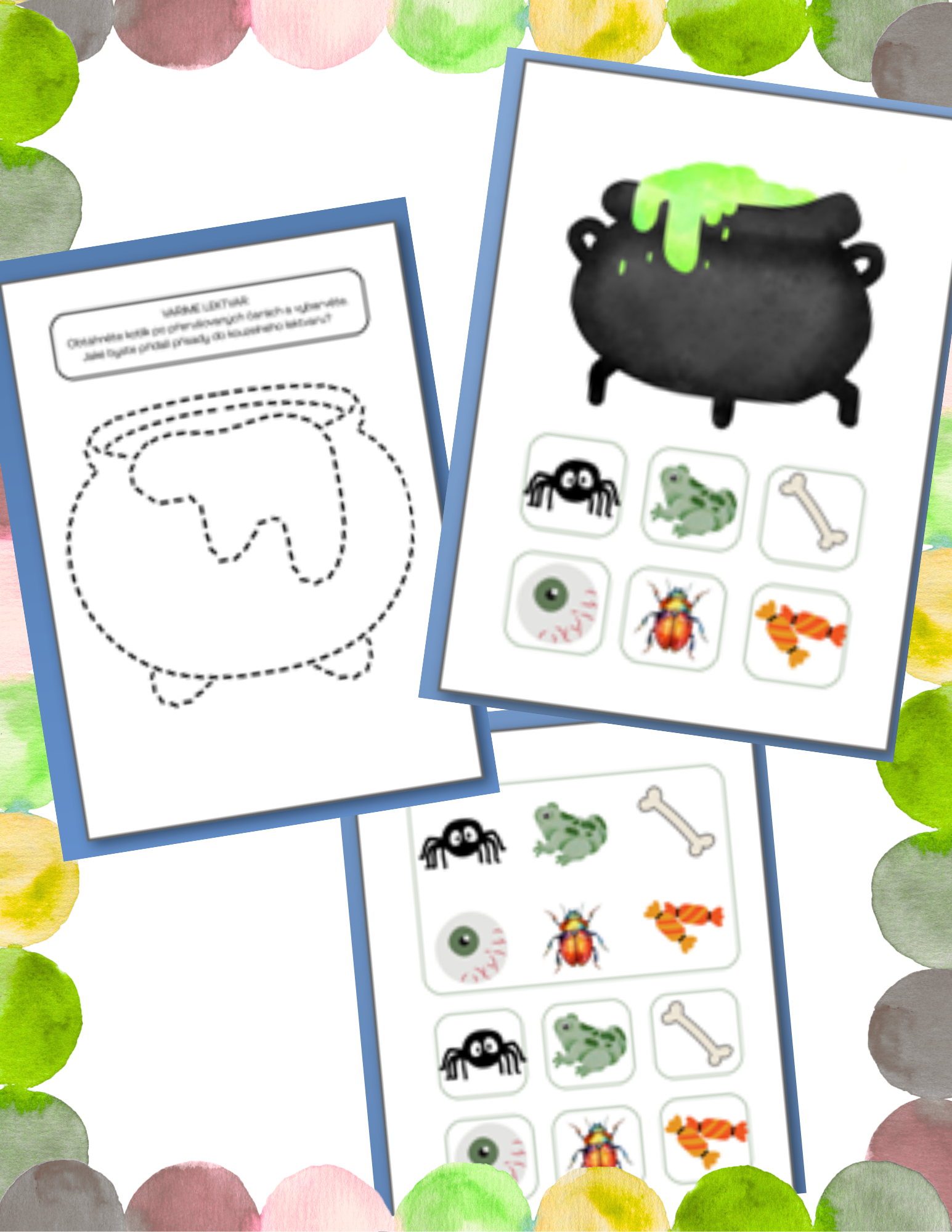 Omalovánka, kdy děti mají za úkol spojit obrázek kotlíku podle přerušovaných čar, vybarvit jej, nalepit do kotlíku přísady a vytvořit tak kouzelný lektvar.