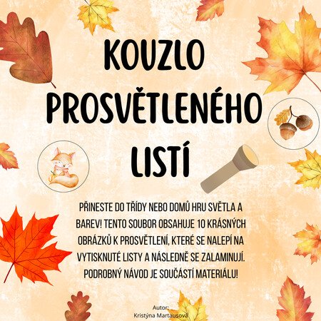 Materiál rozvíjí jemnou motoriku (stříhání a laminování) a pozornost při hře se světlem. Ideální aktivita pro objevování kouzla podzimu v mateřské škole.