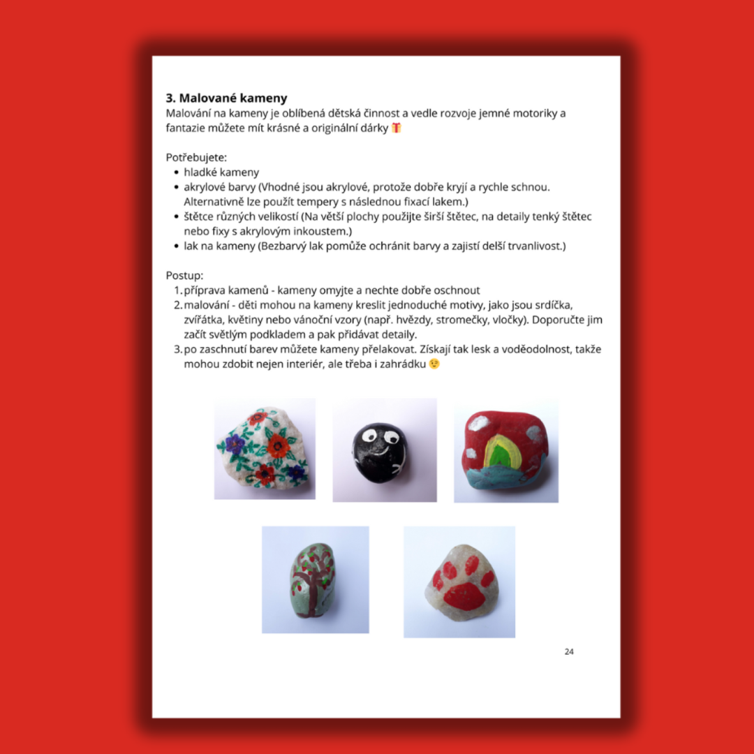 Každý návod obsahuje přehledný seznam potřebného materiálu a postup krok za krokem. Některé dárky zvládnete z běžných pomůcek, u jiných bude potřeba pár drobností dokoupit – všechny jsou ale snadné a efektní.