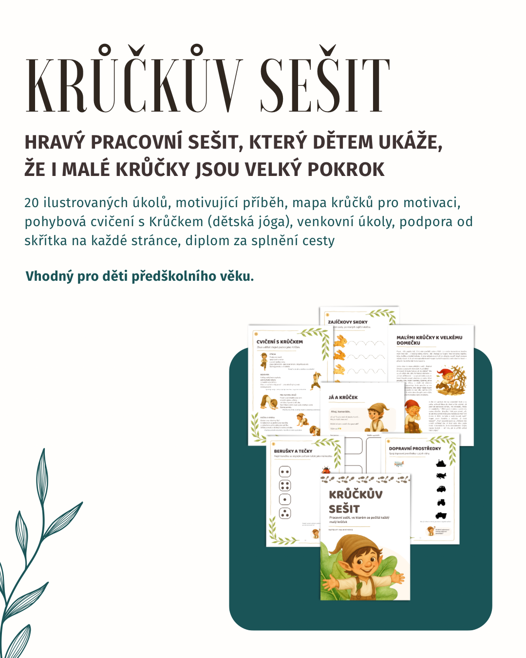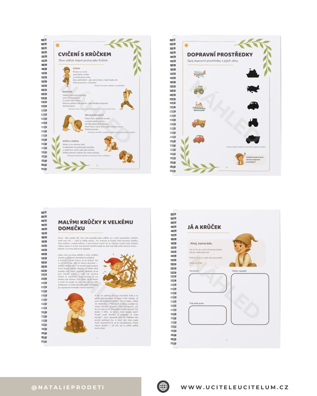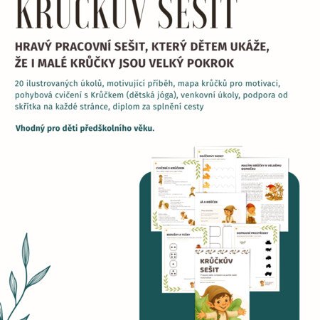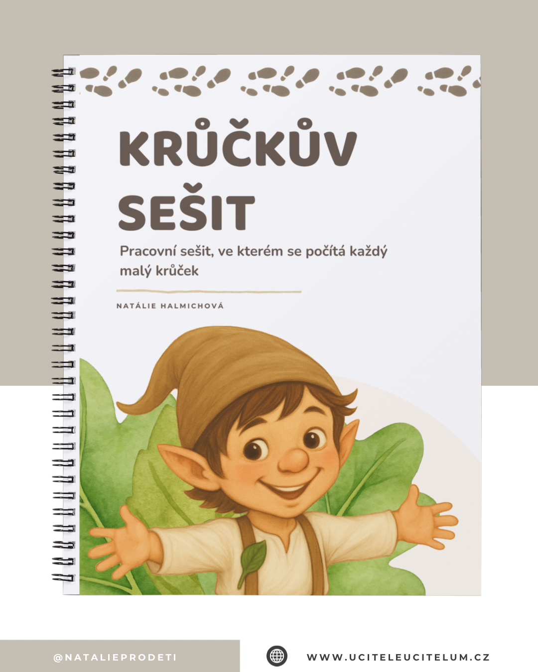 Průvodcem sešitu je malý skřítek Krůček, který děti učí, že není důležité být dokonalý. Důležité je zkoušet, tvořit, objevovat a radovat se z každého malého pokroku — protože každý malý krůček se počítá. 🌱