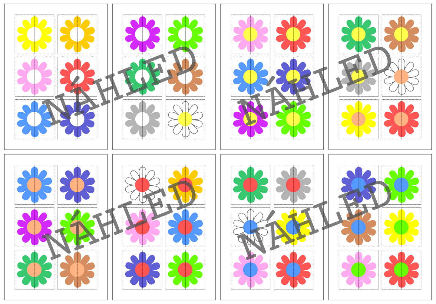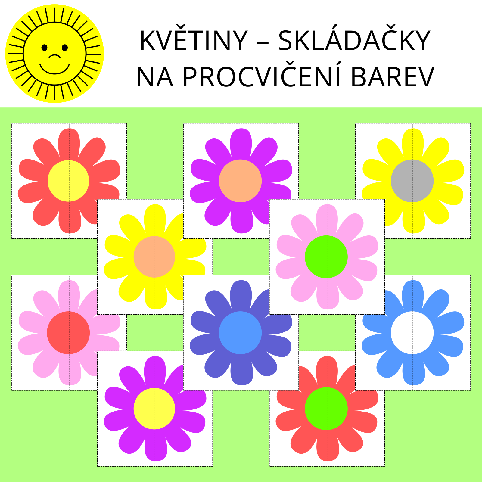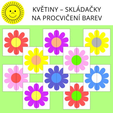 Materiál obsahuje skládačky 54 obrázků květin (1 strana = 6 skládaček). Obrázky jsou rozděleny na dvě části.