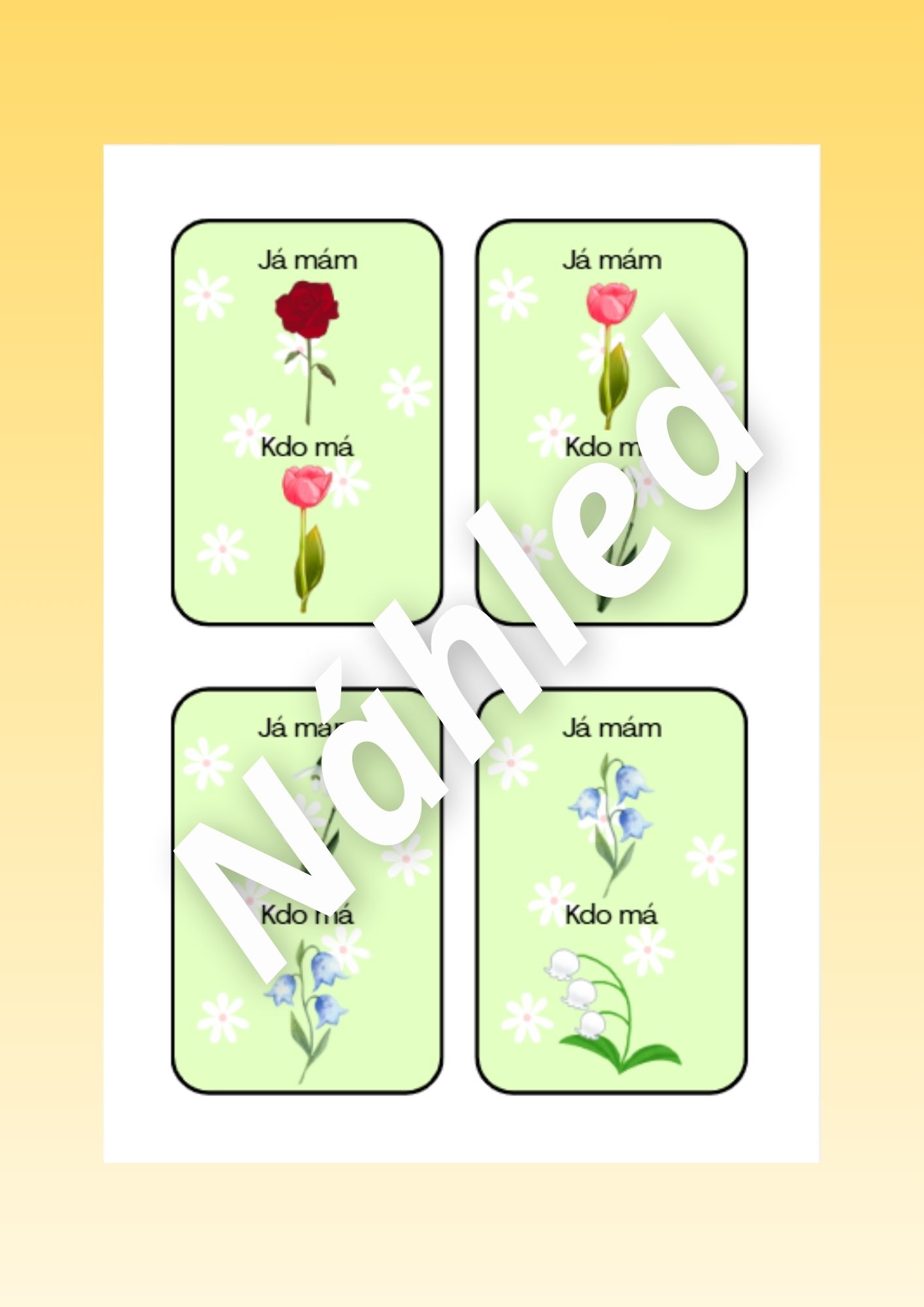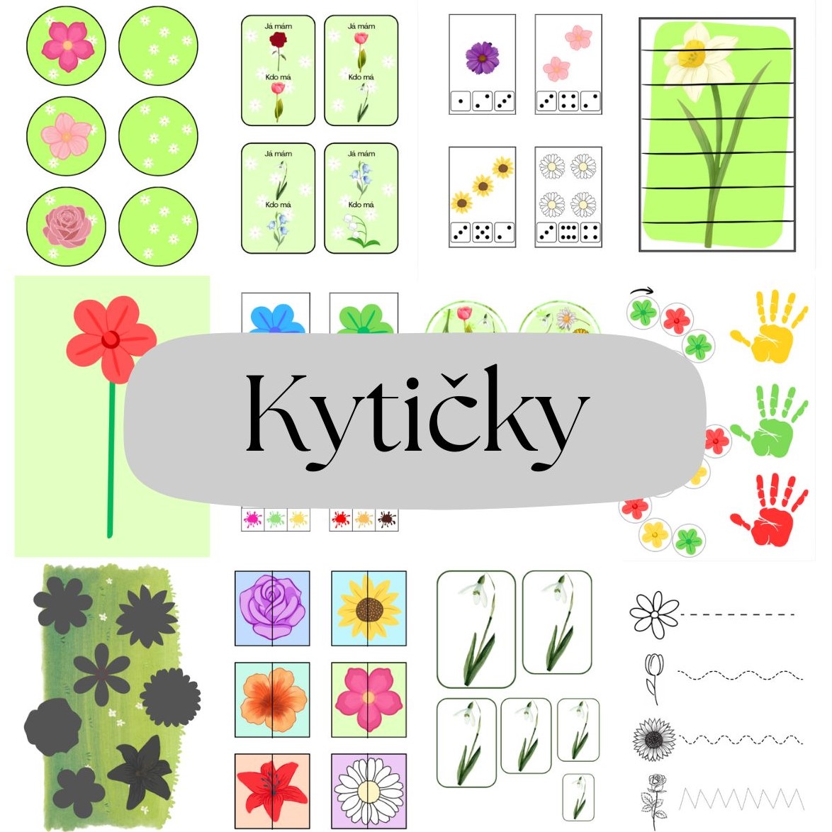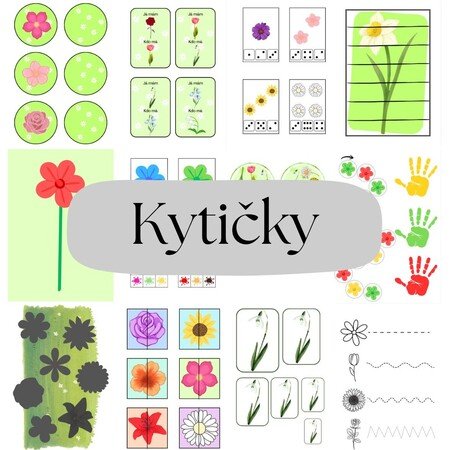 - Kartičky kytiček (str. 3-5) - děti si kartičky prohlížejí, pojmenovávají a mohou je třídit podle zadání