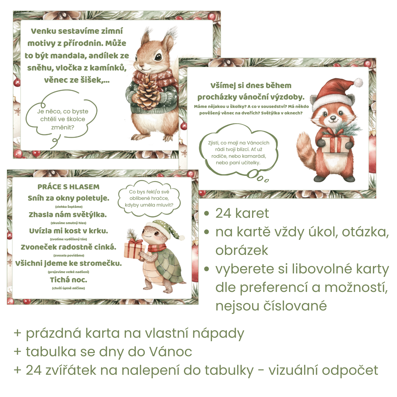 - tabulku s přehledem 24 dnů (můžeme vybarvovat, škrtat, nalepovat zvířátka)