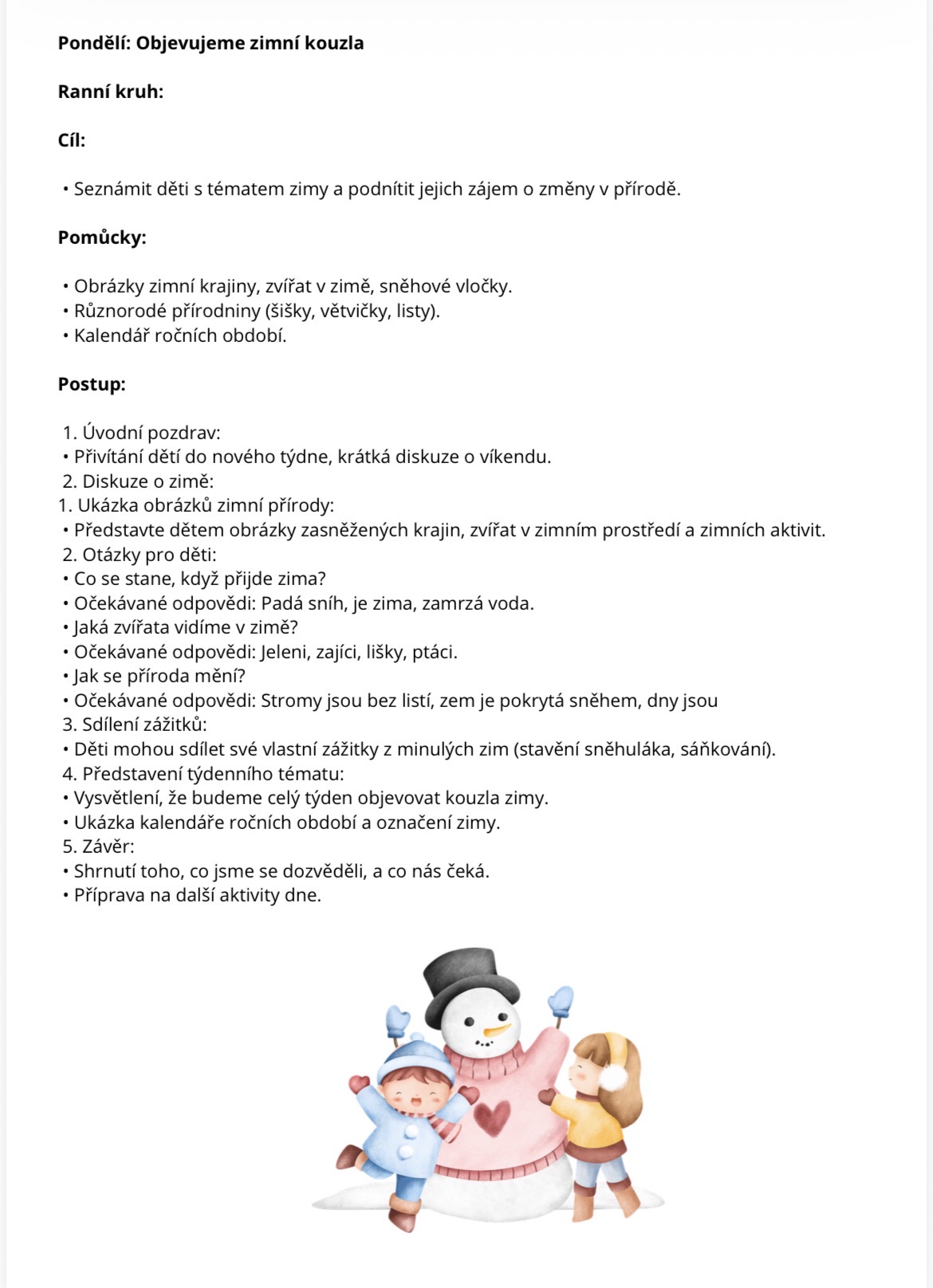 Soubor obsahuje přípravu na každý týden a jednotlivé dny - ranní kruh, nabízené činnosti a aktivity, komunitní kruh, hlavní činnosti, včetně vzdělávacích cílů, očekávaných výstupů a klíčových kompetencí.