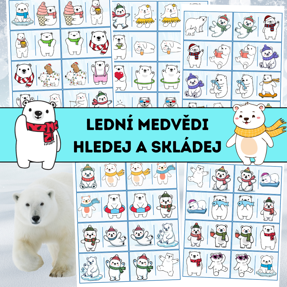 Lední medvědi – hledej a skládej je obrázková aktivita inspirovaná principem domina, zaměřená na rozvoj zrakové percepce, pozornosti, vizuální paměti a schopnosti porovnávání. Děti pracují s obrázkovými kartičkami, hledají stejné medvědy a navazují je do řady, čímž vzniká tzv. „domino had“.
