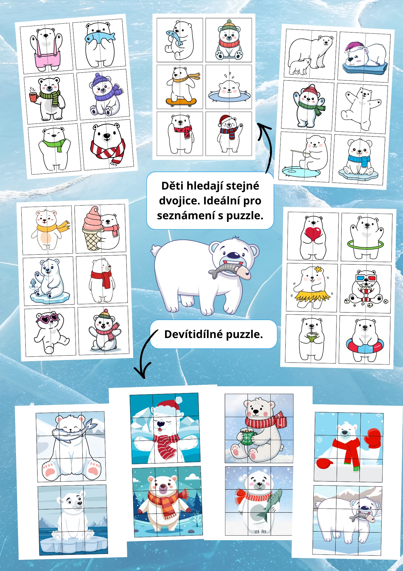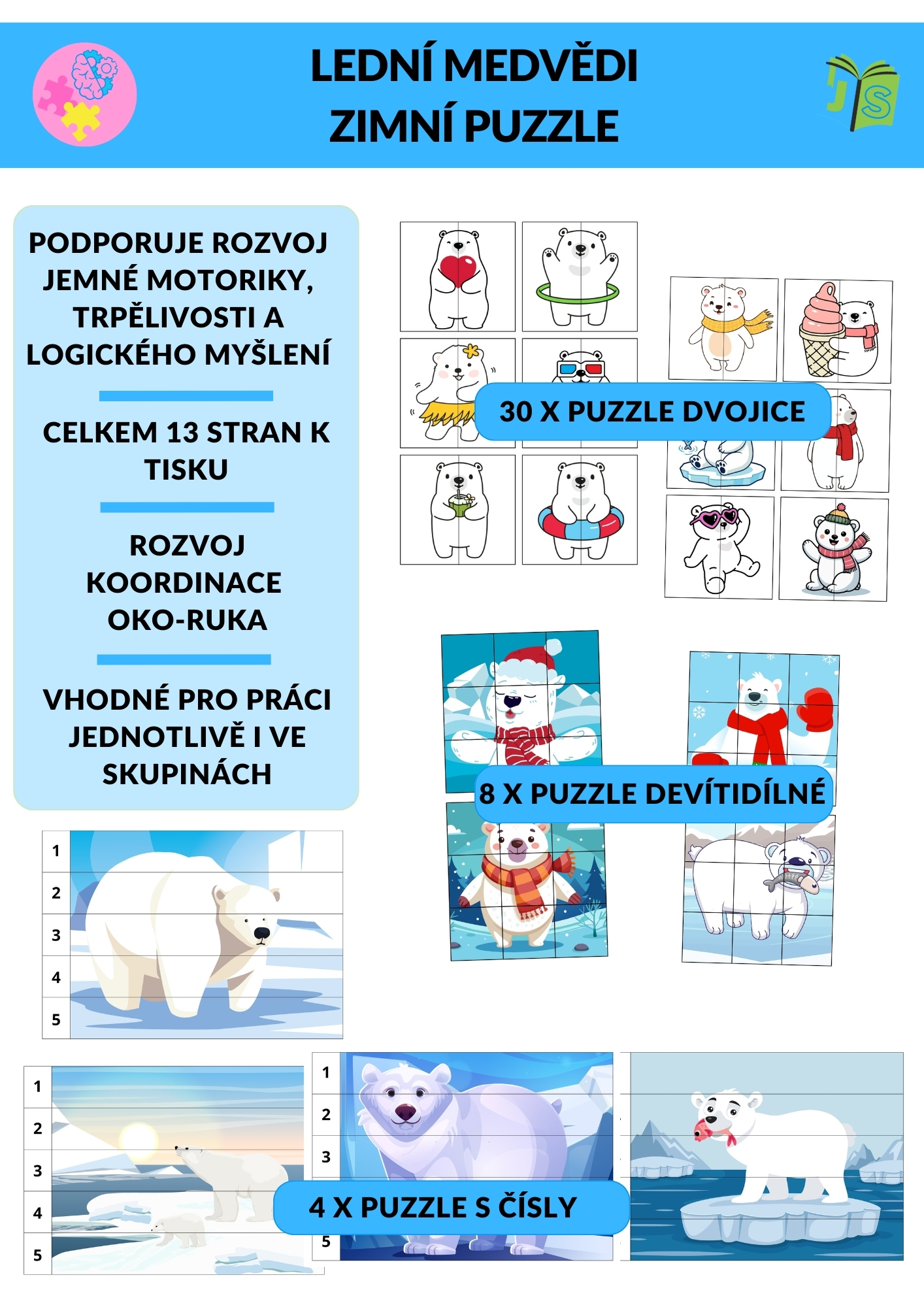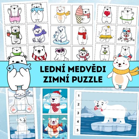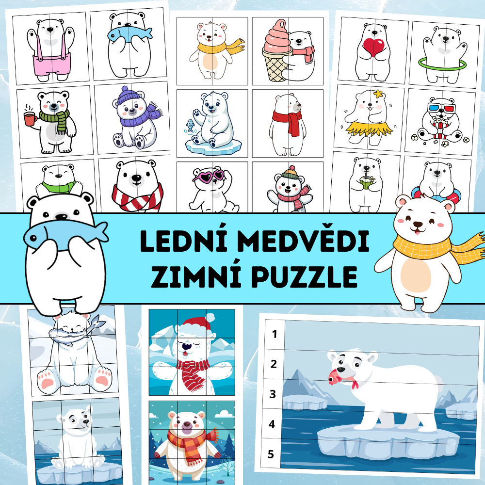 Lední medvědi – zimní puzzle je obrázková aktivita zaměřená na rozvoj vizuální percepce, pozornosti, jemné motoriky a logického myšlení u dětí předškolního a mladšího školního věku. Materiál obsahuje tři typy puzzle úkolů různé náročnosti – párování obrázků, skládání devítidílného puzzle a skládání obrázků podle čísel 1–5.