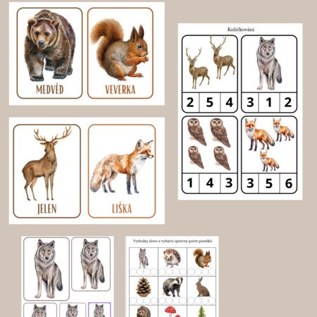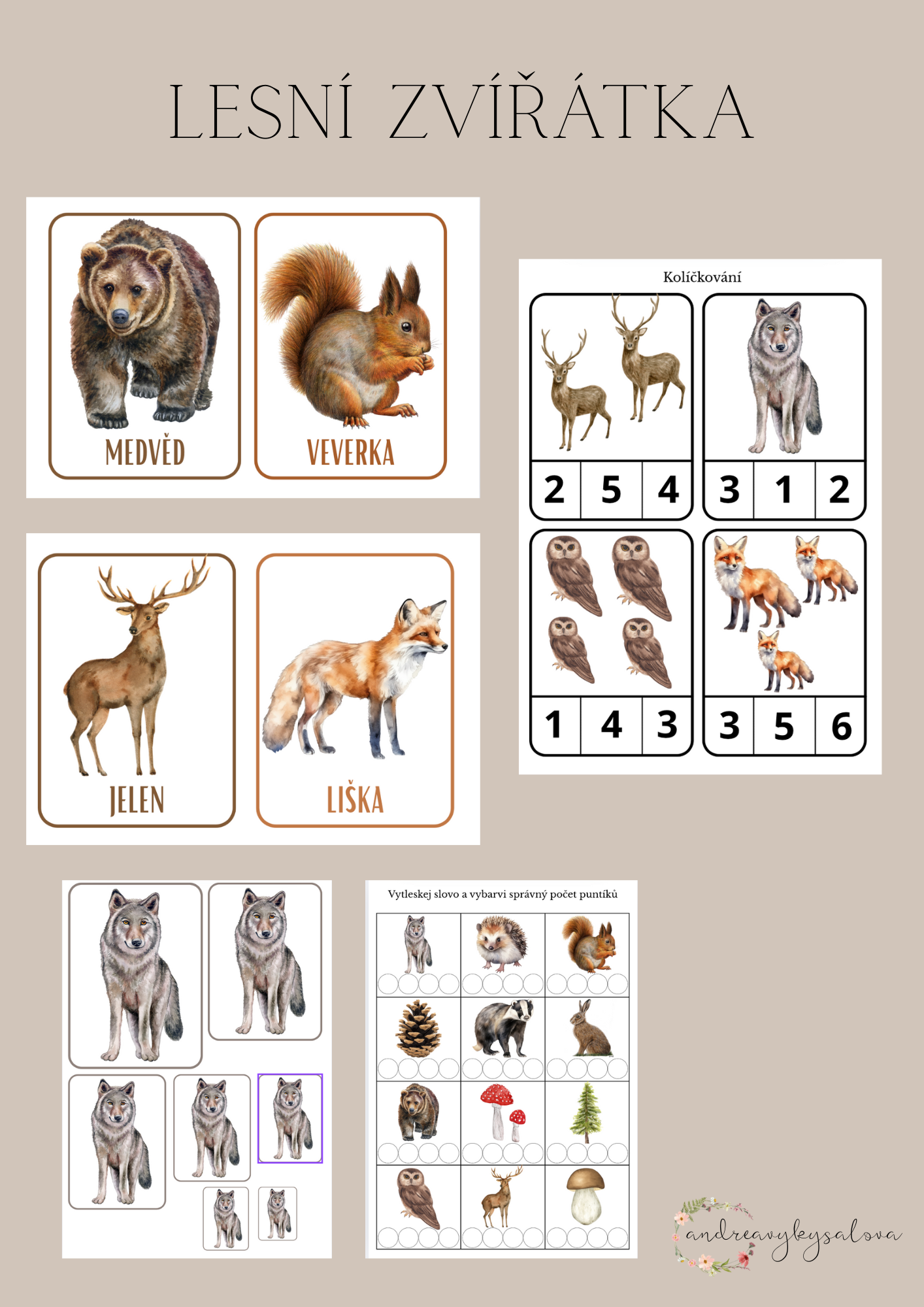 Tento soubor obsahuje 16 demonstračních karet lesních živočichů.🦔 Dále v souboru naleznete 8 karet kolíčkování, 2 pracovní listy (vytleskávání slabik, bludiště) a 2 sady na porovnávání dle velikosti.🐻