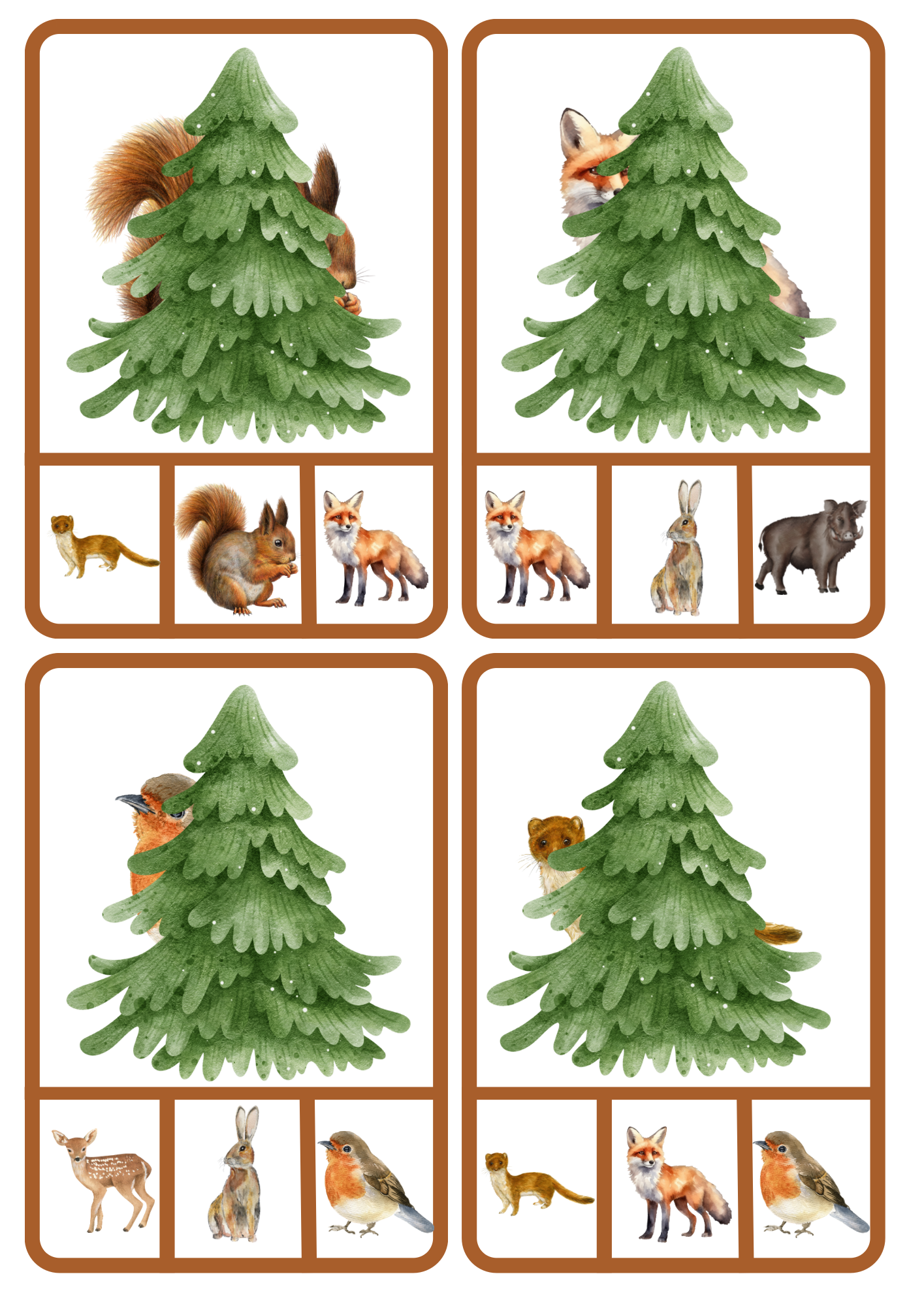 Děti mají před sebou kartu s obrázkem stromu, za kterým se částečně schovává lesní zvířátko. Úkolem dětí je pomocí kolíčku označit to zvířátko, které je schované za stromem.