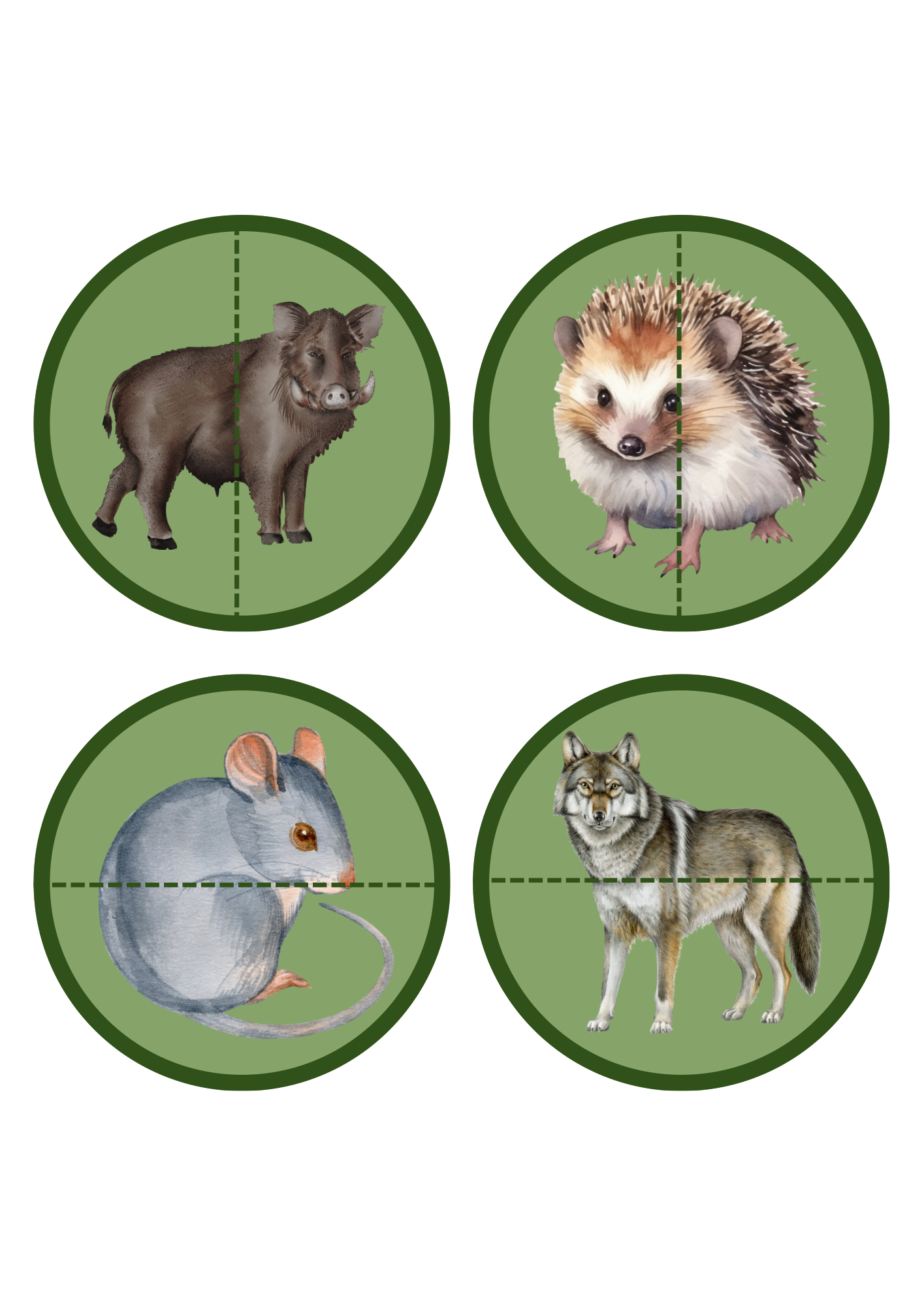 Děti skládají obrázky lesních zvířat rozdělené na dvě nebo čtyři části podle své úrovně dovedností.