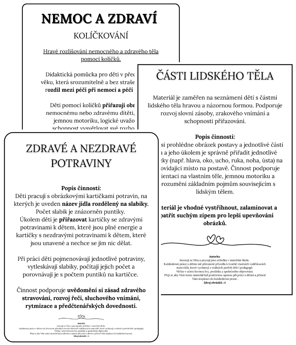 Materiál seznamuje děti s částmi lidského těla hravou a názornou formou a rozvíjí jejich slovní zásobu, zrakové vnímání a schopnost přiřazování. Děti při činnosti přiřazují obrázky jednotlivých částí těla na správné místo na postavě. Aktivita podporuje orientaci na vlastním těle, jemnou motoriku a porozumění základním pojmům o lidském těle.
