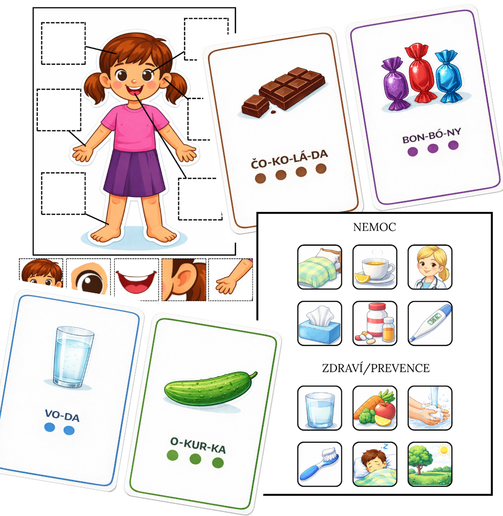 Aktivita seznamuje děti se zdravými a nezdravými potravinami pomocí obrázkových kartiček s názvy rozdělenými na slabiky. Děti přiřazují potraviny k postavám podle toho, zda jim dodávají energii, a zároveň pojmenovávají jídla, vytleskávají a počítají slabiky. Činnost podporuje povědomí o zdravém stravování, rozvoj řeči, sluchové vnímání, rytmus a předčtenářské dovednosti.