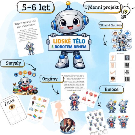 Milé kolegyně, nabízím Vám týdenní projekt pro předškolní děti zaměřený na lidské tělo. Motivační postavou v projektu je robot Ben, který děti provází celým týdnem. Společně se učí základní pojmy lidského těla, orgány, smysly, emoce i smysl zdravého životního stylu.