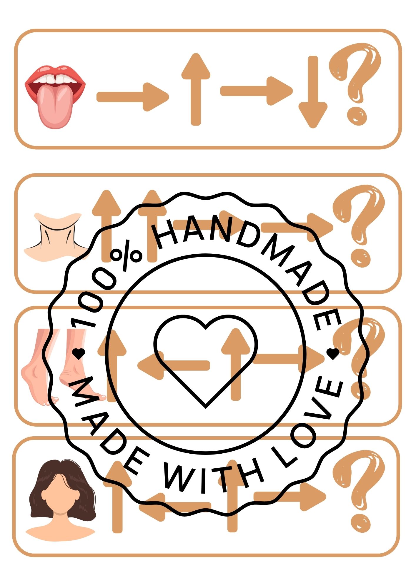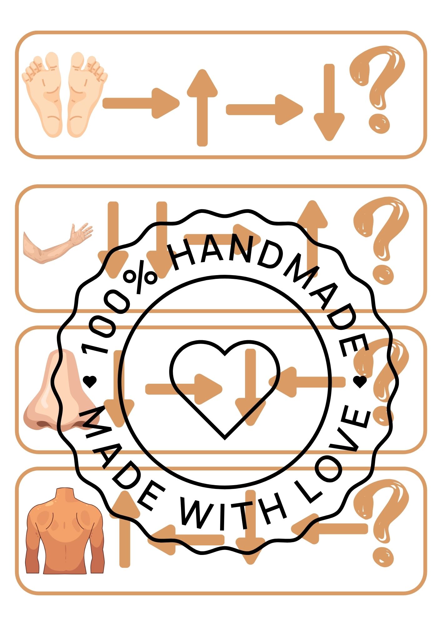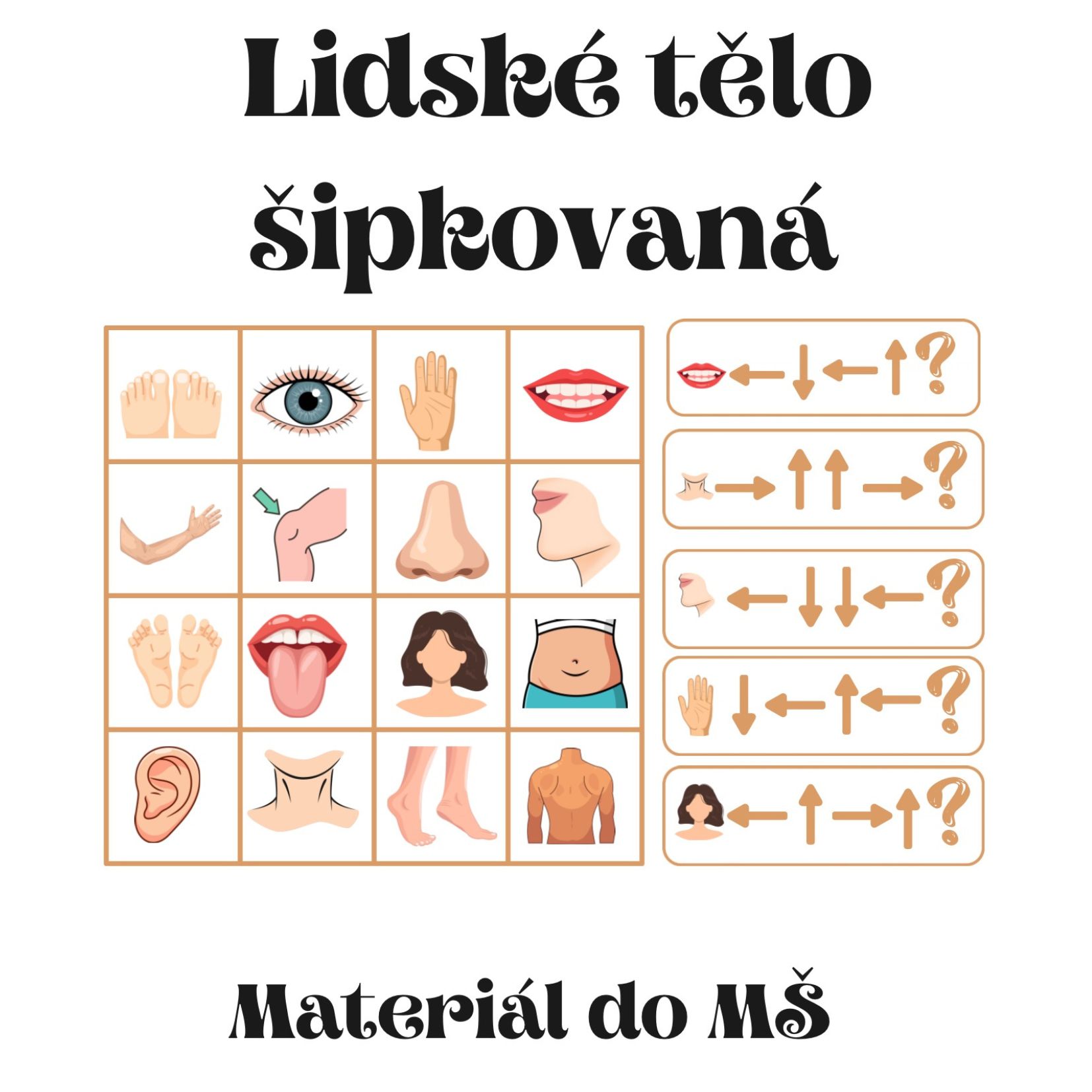 Úkol je jednoduchý – podle šipek zjistit, jaká část lidského těla je na konci cesty, a místo otazníku přiložit správný obrázek (např. oko, ruka, noha, nos…).