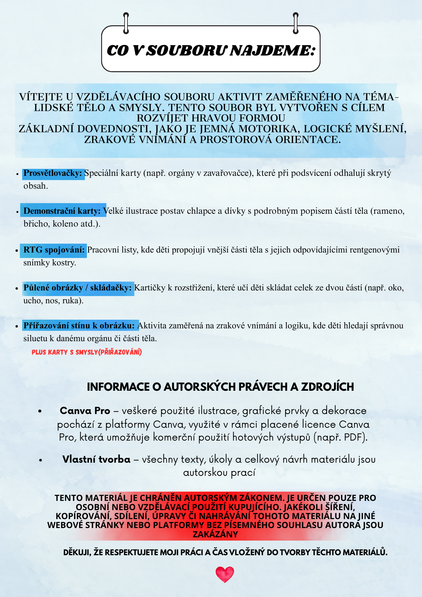 Co soubor obsahuje: Demonstrační karty: Velké karty slouží jako základ pro výuku. Povídejte si s dětmi o tom, co je na
