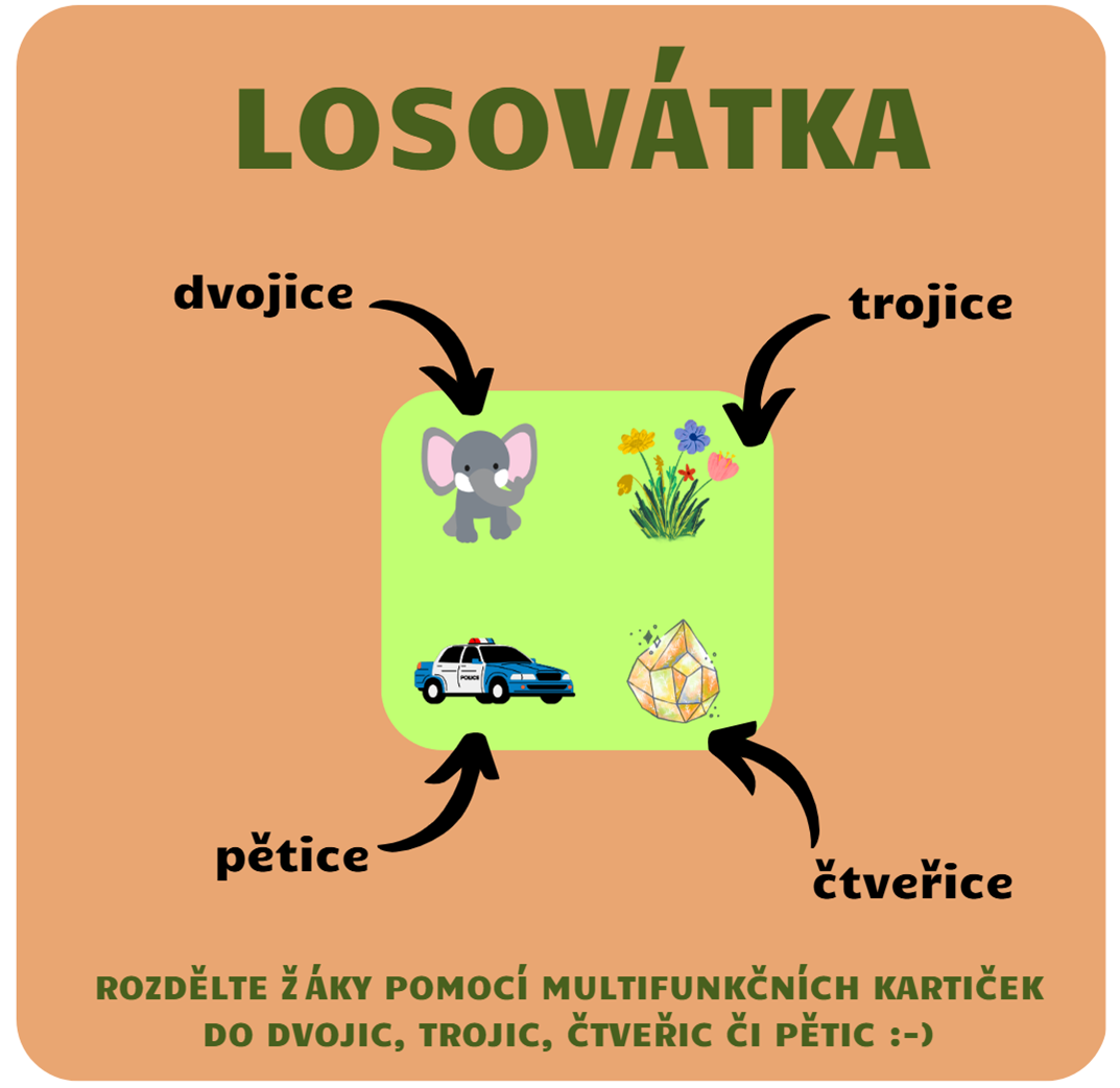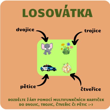 Soubor obsahuje 24 multifunkčních kartiček, které Vám pohomou žáky náhodně rozdělit do dvojic, trojic, čtveřic či pětic. V případě pětic se jedná o 4 pětice a 1 čtveřici.
