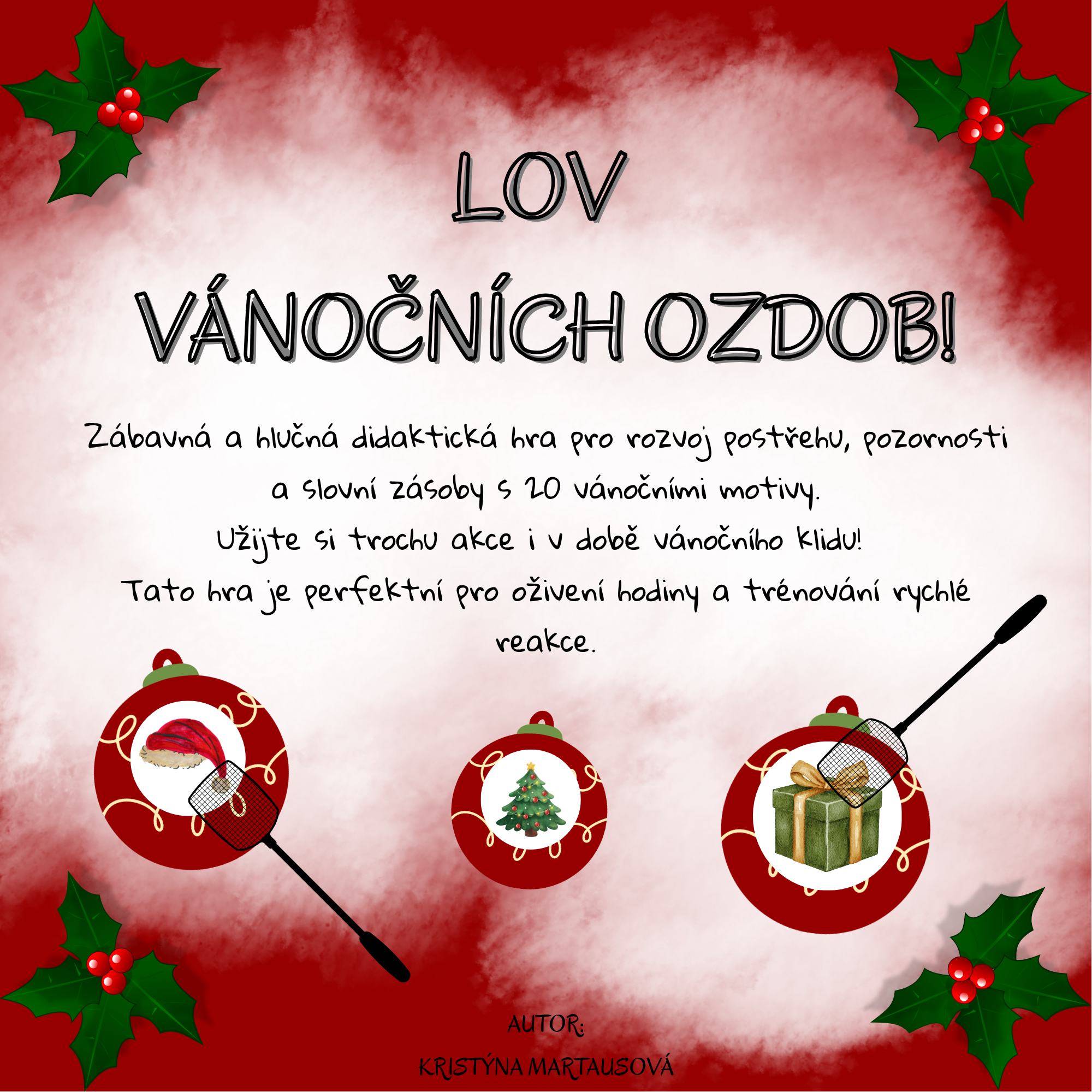 Hra se skládá z 20 kartiček s obrázky vánočních ozdob a motivů (např. zvoneček, dárek, kometa, cukroví). Všechny obrázky rozložíte na podlahu nebo stůl. Hráči dostanou plácačky na mouchy. Učitel nahlas řekne název obrázku. Úkolem dětí je co nejrychleji daný obrázek plácačkou trefit a "plácnout" ho. Kdo je rychlejší, získává bod!