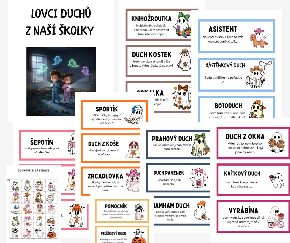 Příprava: Paní učitelka nejprve schová obrázky duchů na místa, která jsou napsaná na kartičkách (např. do knihovny, k hodinám, ke dveřím atd.).