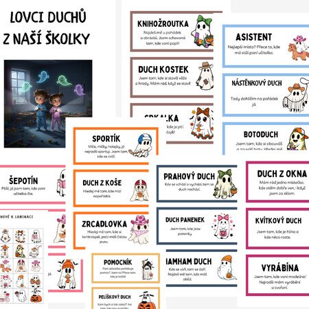 - Start: Děti se stanou "Lovci duchů" a dostanou (nebo si vylosují) jednu z kartiček s nápovědou.