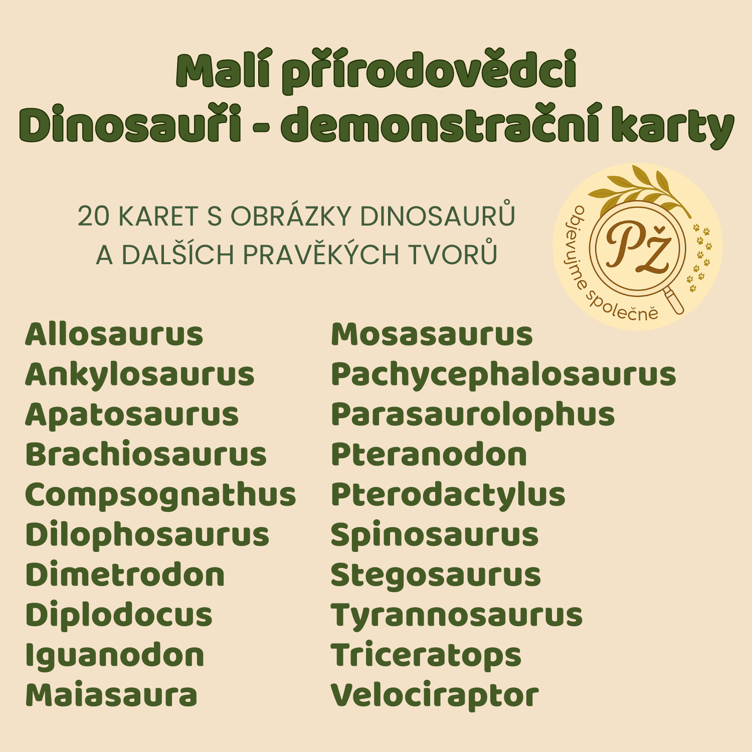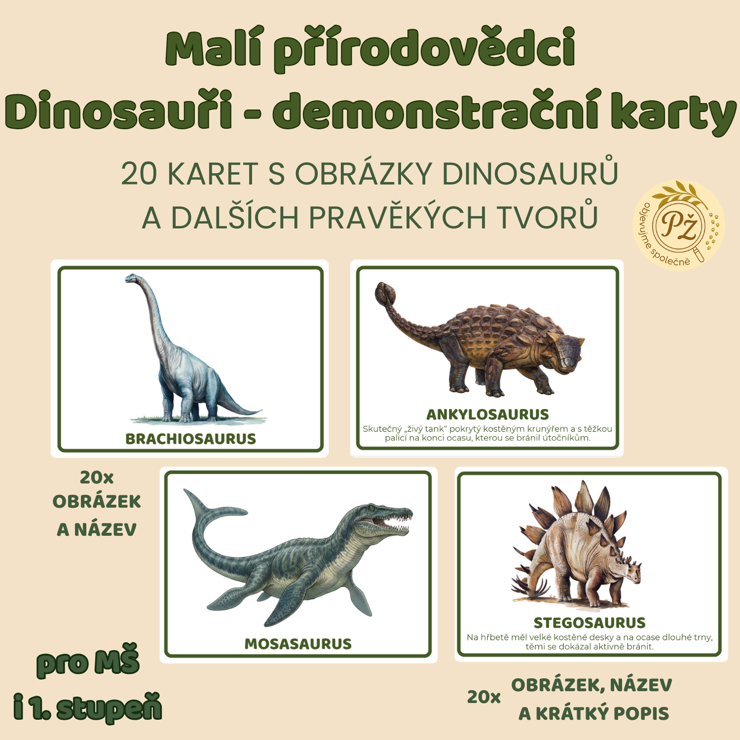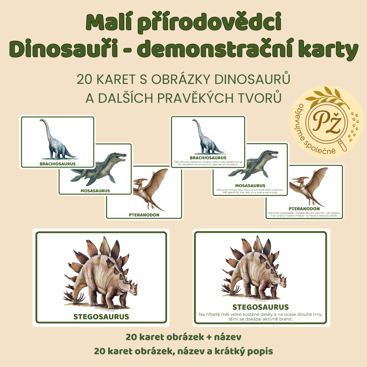 Soubor obsahuje 20 demonstračních karet s obrázky dinosaurů a dalších pravěkých tvorů. Každá karta ukazuje obrázek dinosaura a jeho název. Případně můžeme využít karty s obrázkem, názvem a kratičkým popisem daného druhu. To se hodí při všetečných otázkách malých objevitelů! :)