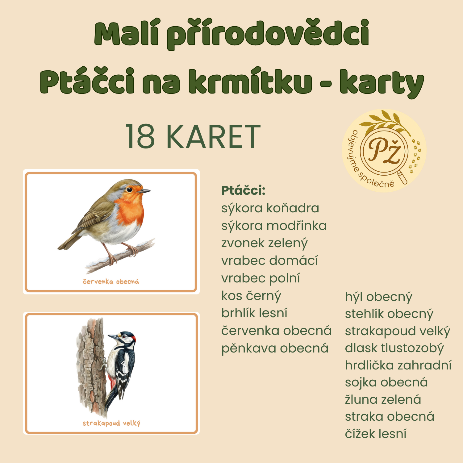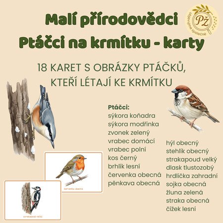 Soubor obsahuje 18 demonstračních karet s obrázky běžných ptáků létajících ke krmítku. Každá karta obsahuje obrázek zvířete a jeho název.