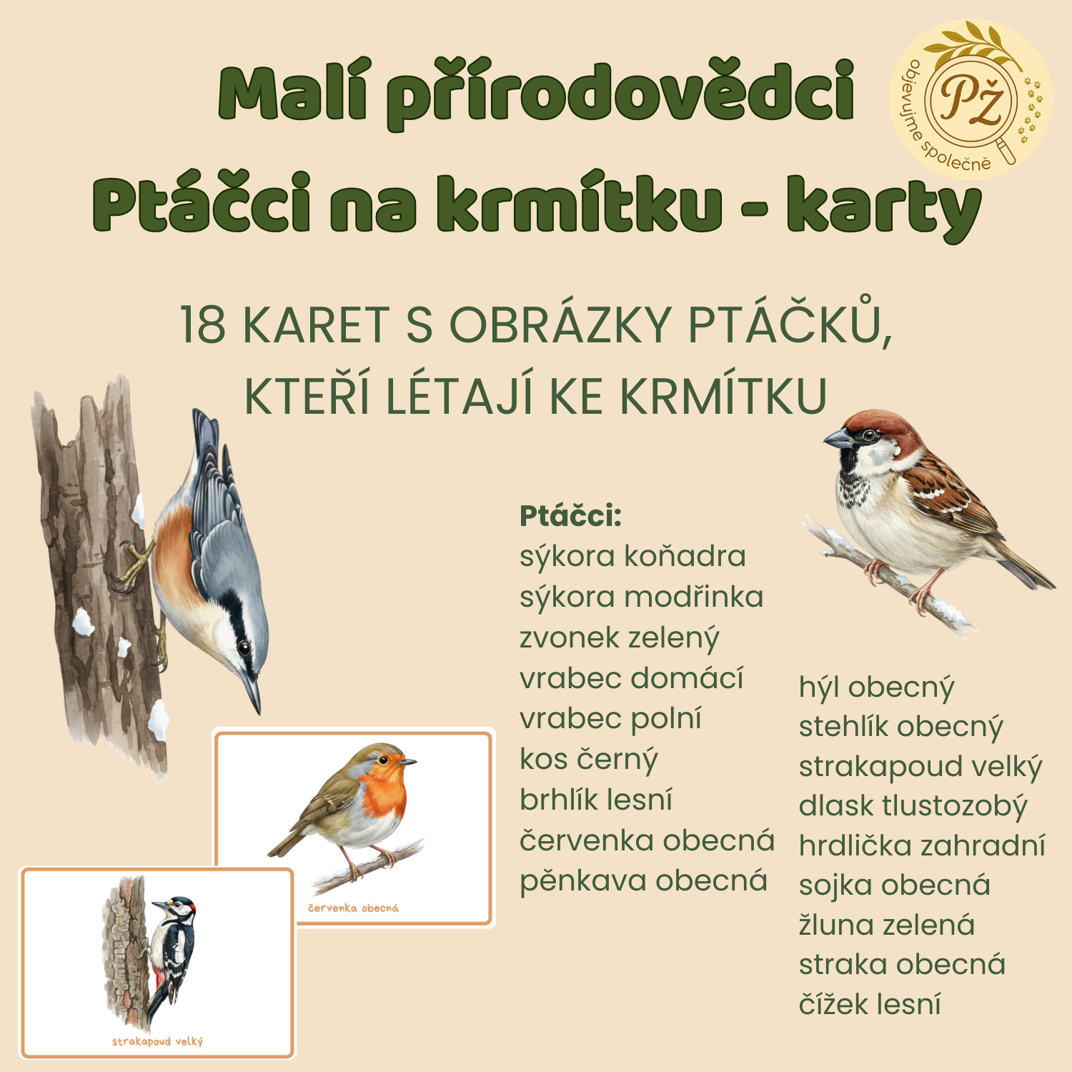Demonstrační kartičky ptáčků u krmítka vám pomohou při pozorování a poznávání ptáků. Děti se díky nim naučí poznávat různé druhy ptáčků, pojmenovávat je a všímat si jejich vzhledu. Můžeme je využít při tematických blocích, projektových dnech, při ranních kruzích, motivačních činnostech či při různých hrách. Já propojuji s tvorbou krmítek pro ptáky (Restaurace pro ptáčky), ale využíváme i při procházkách nebo na skautské výpravě.