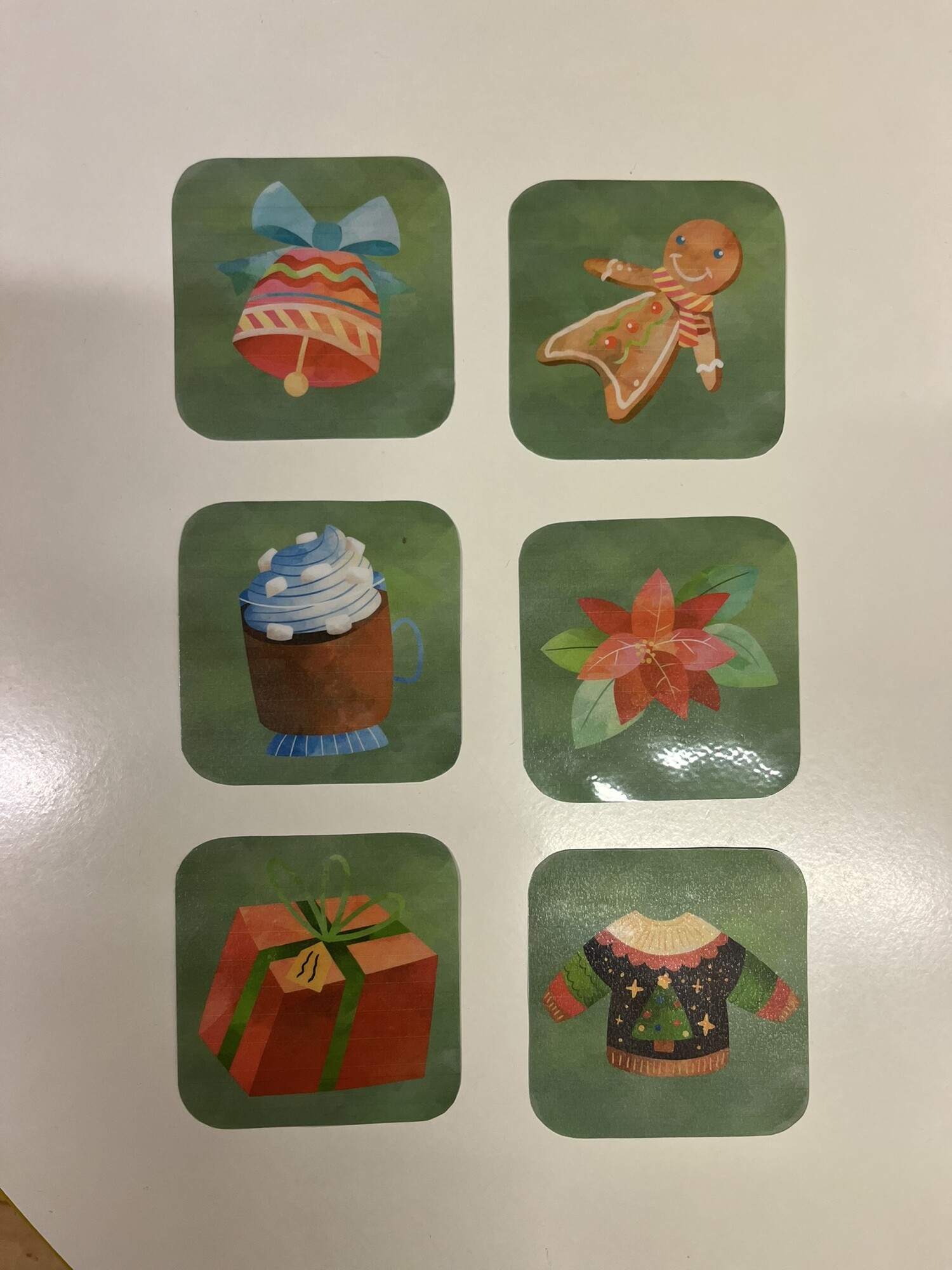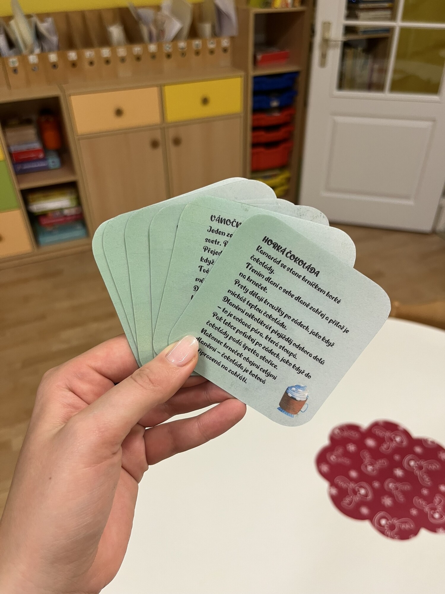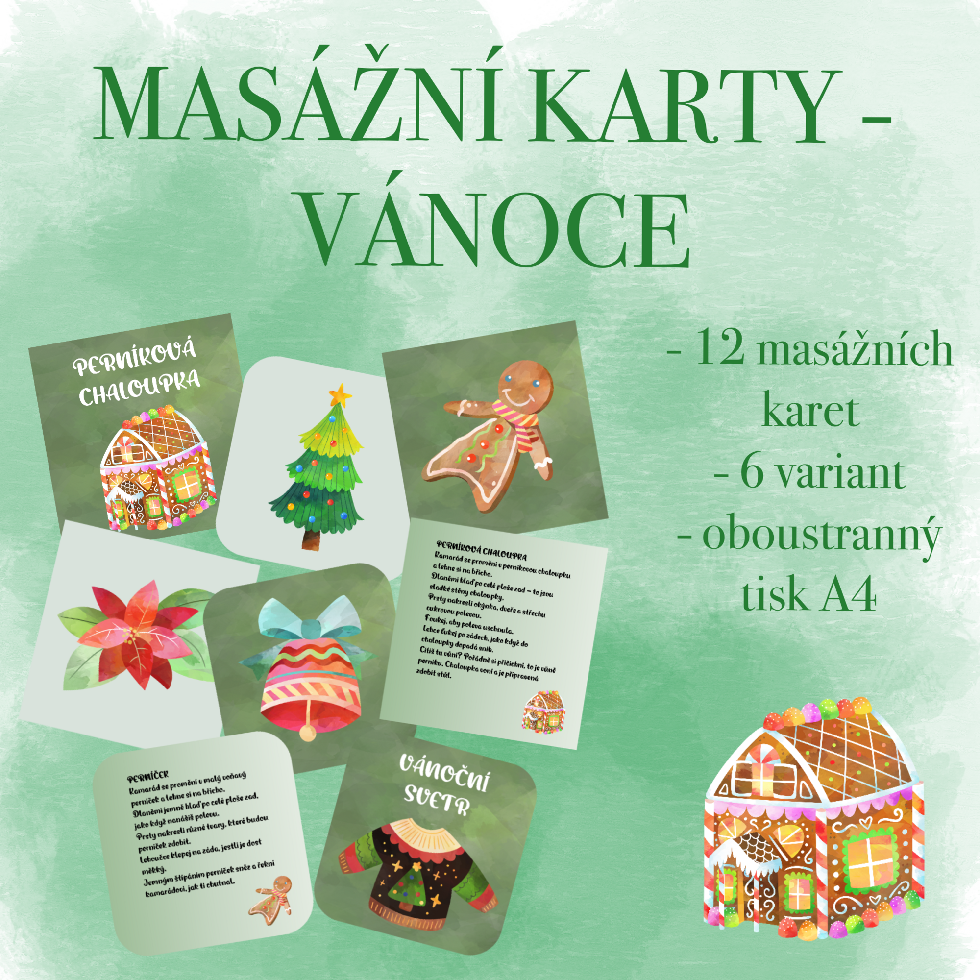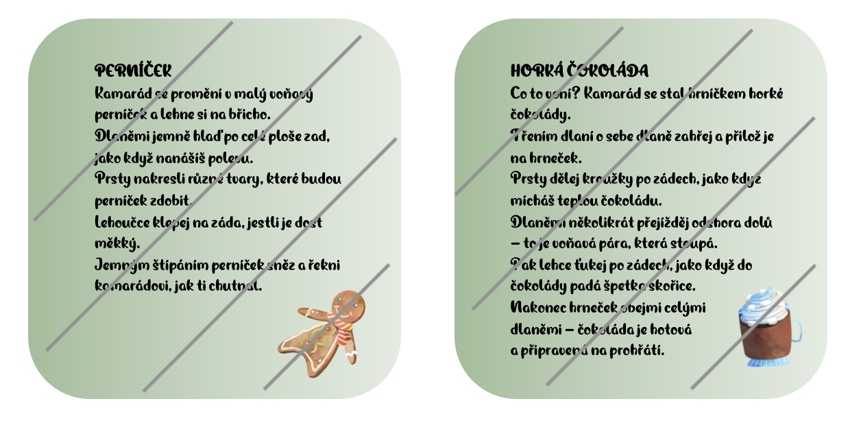 Najdete zde následující masážní karty: zvonek, vánoční svetr, horká čokoláda, perníček, vánoční hvězda, dárek, svíčka, vánoční stromek, skořice, dopis pro ježíška, perníková chaloupka a hvězda.