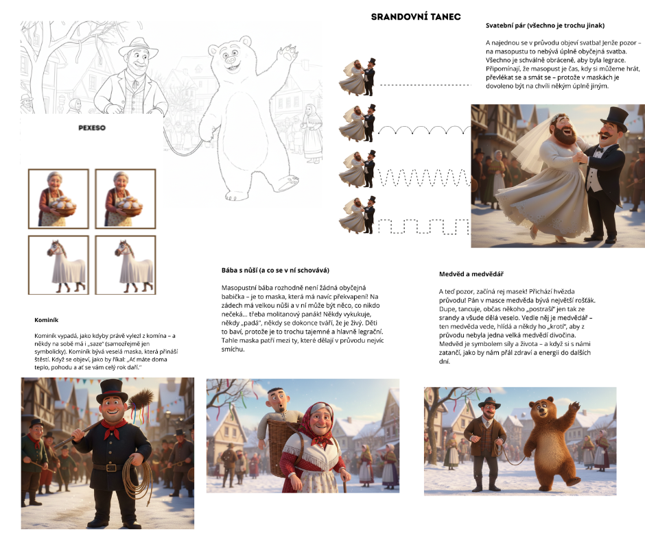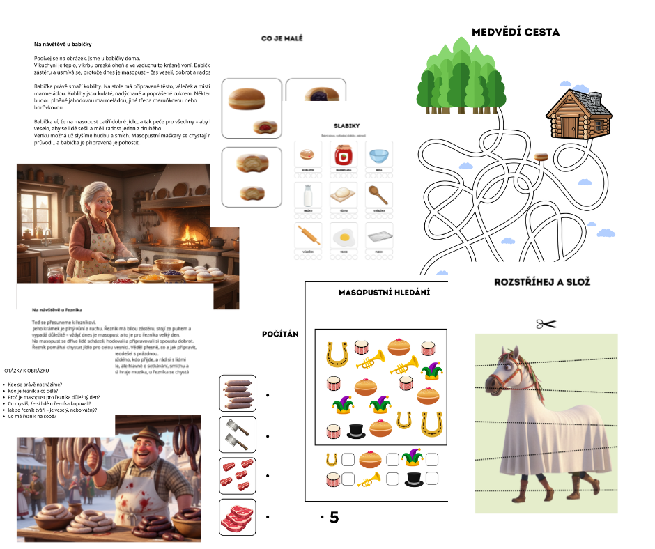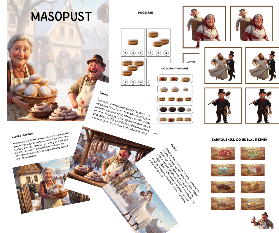 Materiál Masopust přibližuje dětem jednu z nejstarších českých tradic moderní a hravou formou, která je srozumitelná i pro děti v mateřské škole. Prostřednictvím krátkých příběhů, obrázků, otázek a jednoduchých pracovních listů se děti seznamují s tím, co masopust znamená, kdo jsou masopustní postavy a proč se lidé v tomto období scházeli, hodovali a nosili masky.