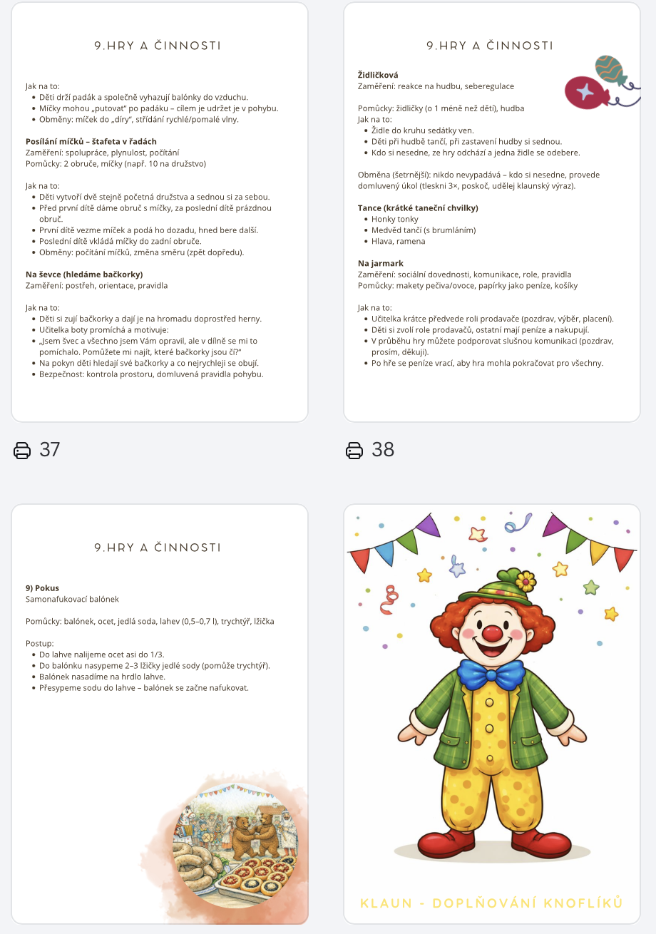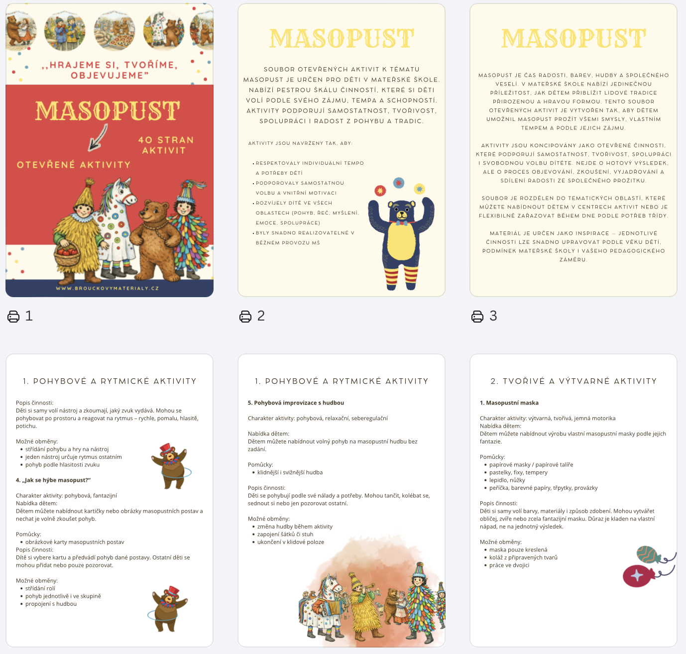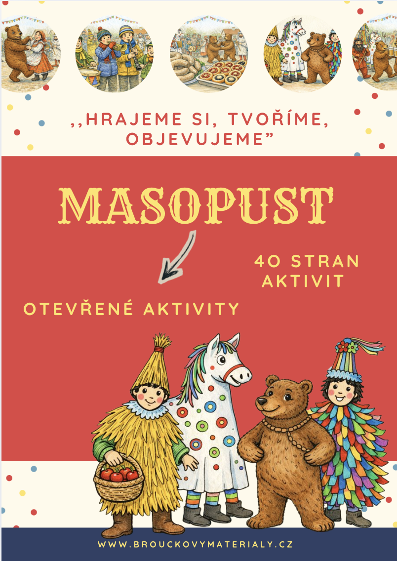 Masopust – otevřené aktivity pro MŠ je praktický soubor plný nápadů, jak s dětmi prožít masopust hravě a smysluplně. Najdete v něm pestré činnosti do center aktivit, otevření činnosti. Aktivity jsou přehledně popsané a snadno realizovatelné v běžném provozu mateřské školy.