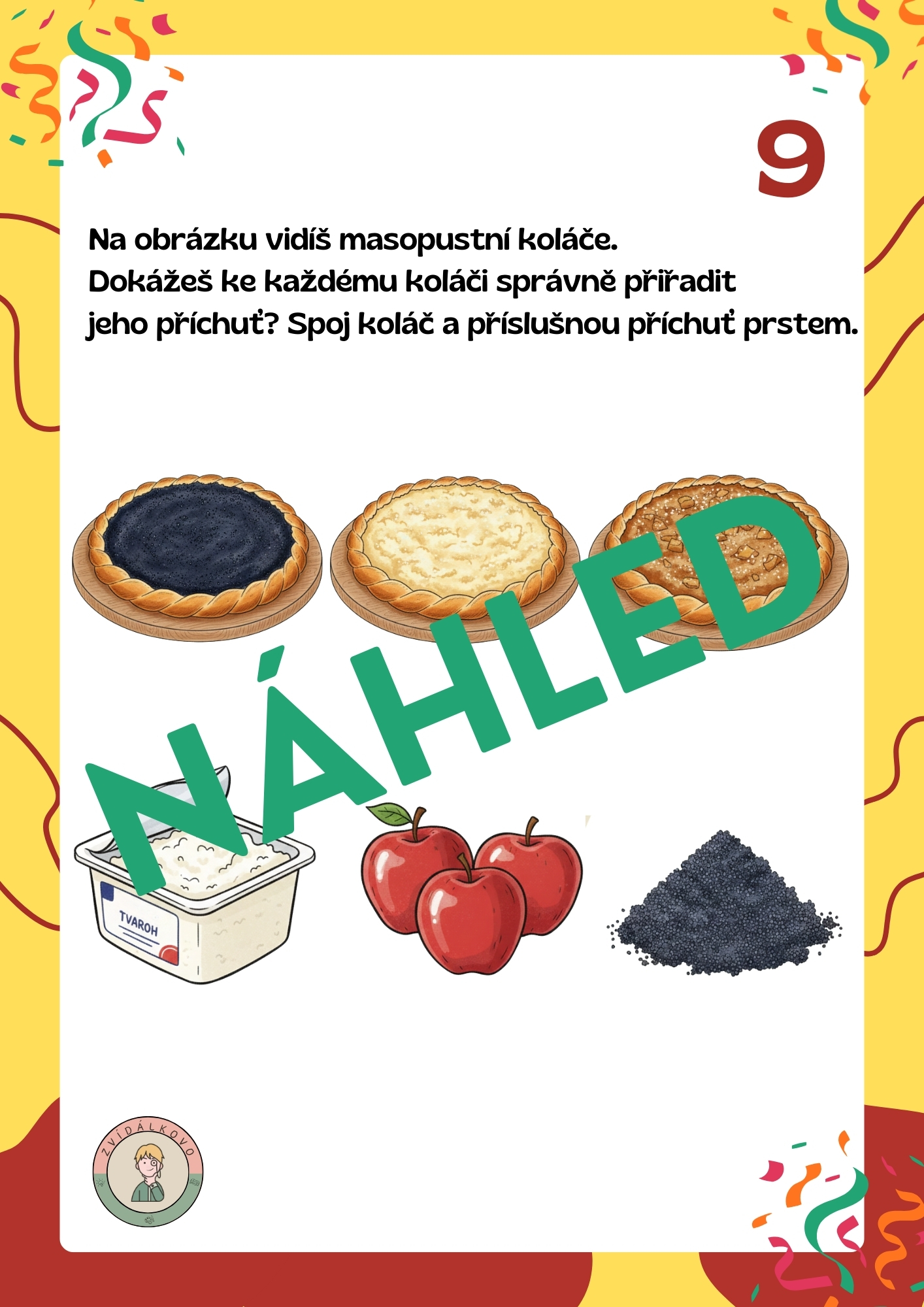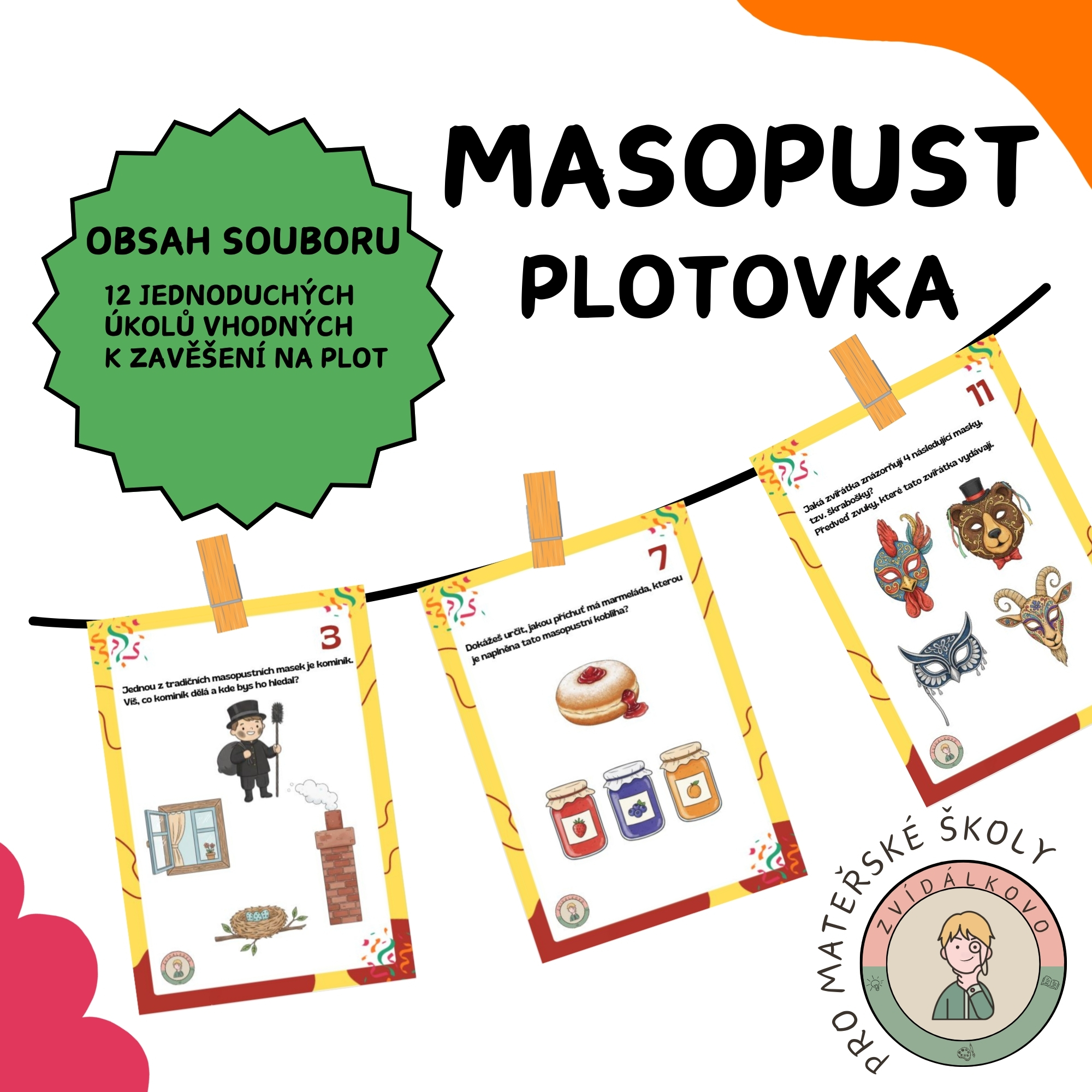 Zvídálkovo Masopustní plotovka je soubor 12 jednoduchých úkolů, který dětem přibližuje masopust a tradice s ním spojené zábavnou a veselou formou. Na každém zastavení čeká na děti krátký úkol s tematikou masopustu, u kterého si procvičí pohyb, fantazii, soustředěnost, ale i předmatematické představy nebo sluchové či zrakové vnímání.