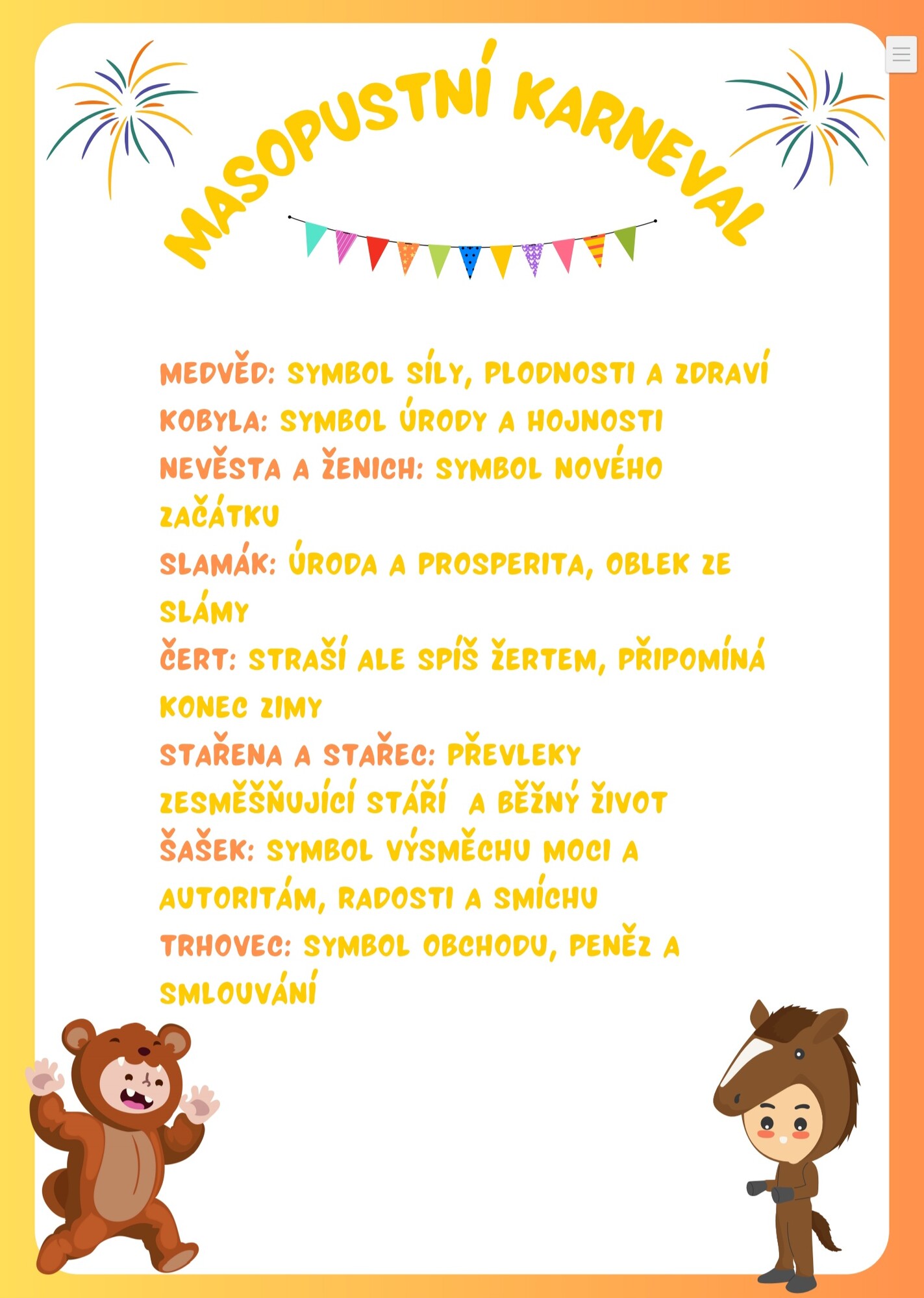 Soubor obsahuje stíny, přikryté obrázky, přiřazování barev, kolíčkování správného obrázku a počtu, zdobenzdoben koláčku dle karty s předlohou, větší menší a demonstrační karty. K dispozici vysvětlení symboliky kostýmů spojených s Masopustem.