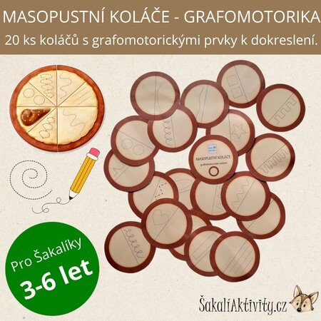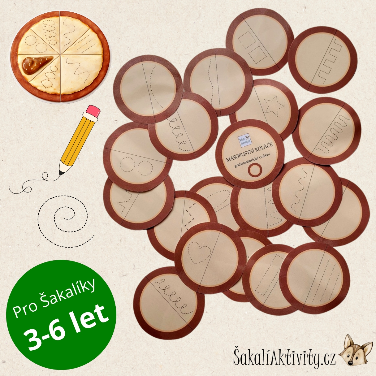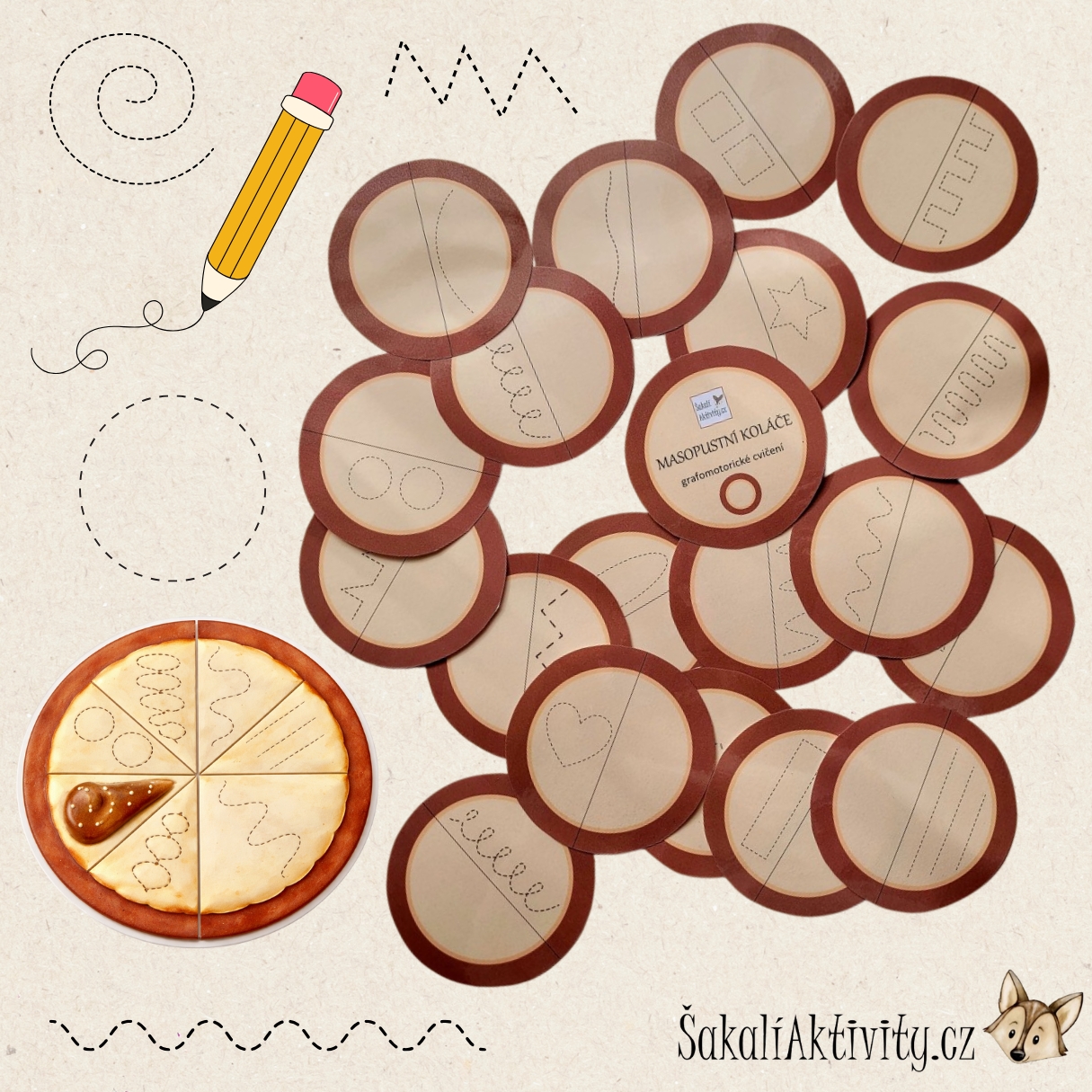 Masopustní koláče – grafomotorické cvičení je tematická vzdělávací aktivita určená pro předškolní děti i mladší školáky. Hravou formou podporuje rozvoj grafomotoriky, uvolnění ruky a přípravu na psaní. Aktivita je vhodná nejen do období masopustu a karnevalu, ale i pro celoroční procvičování.
