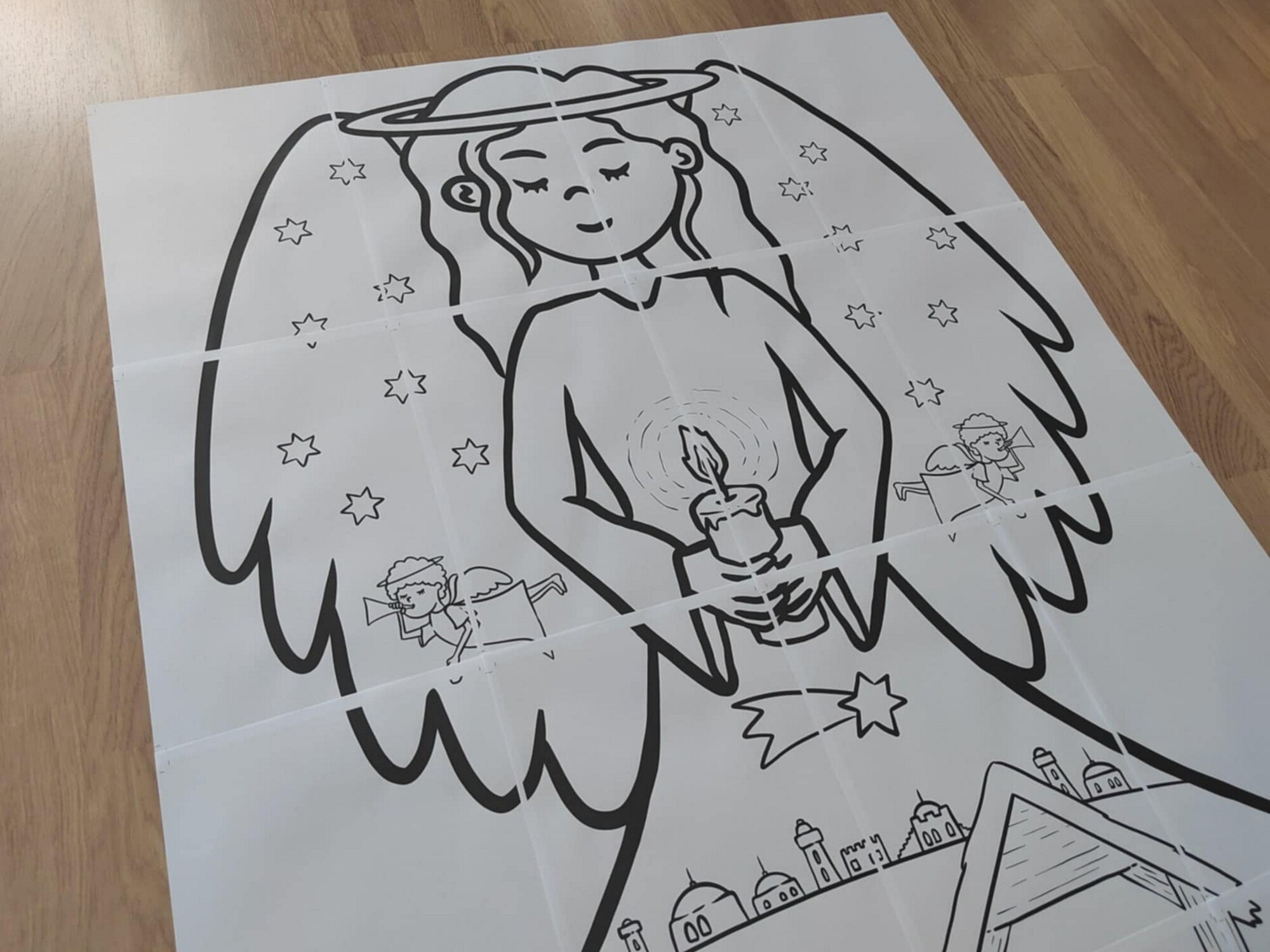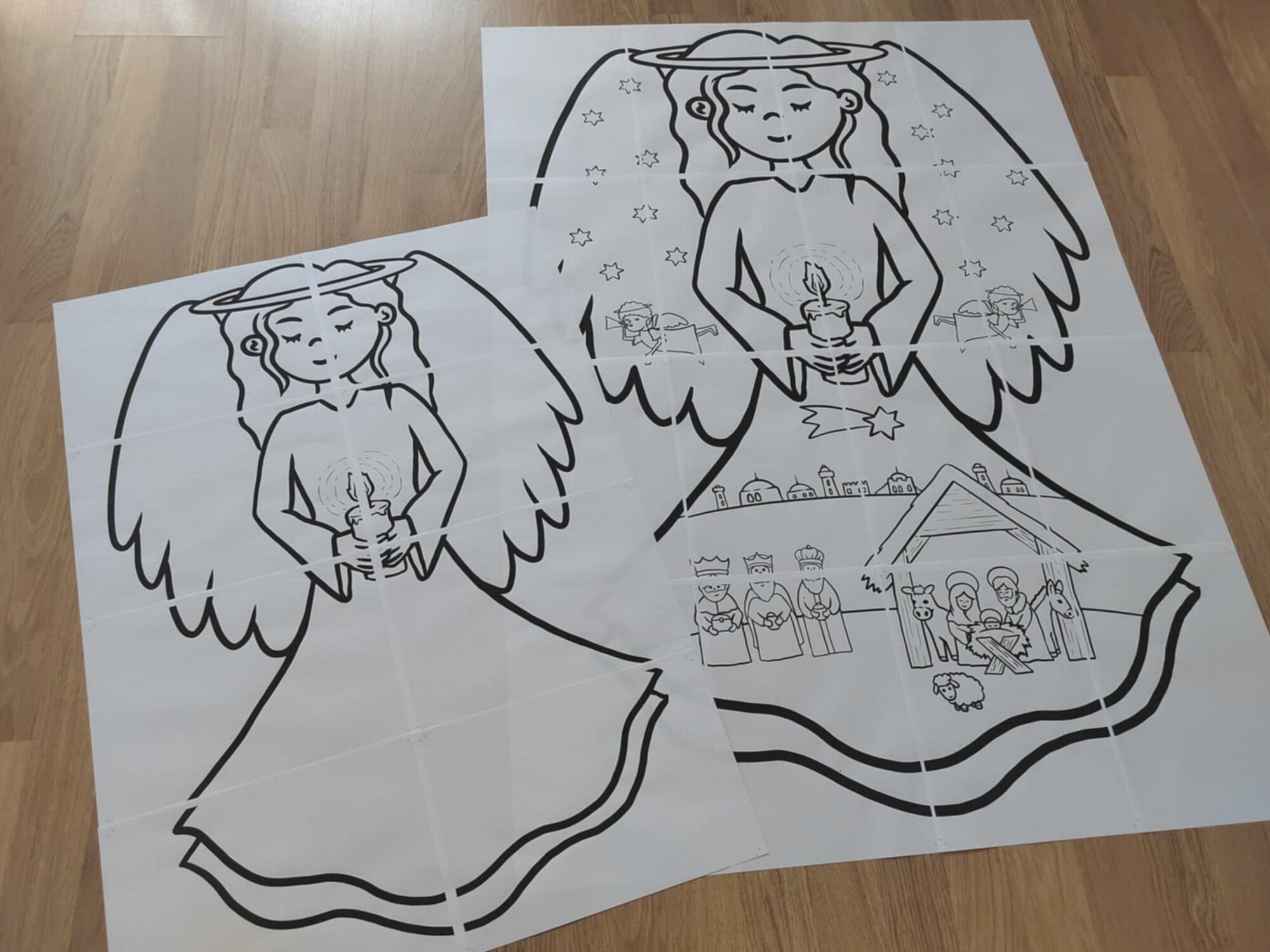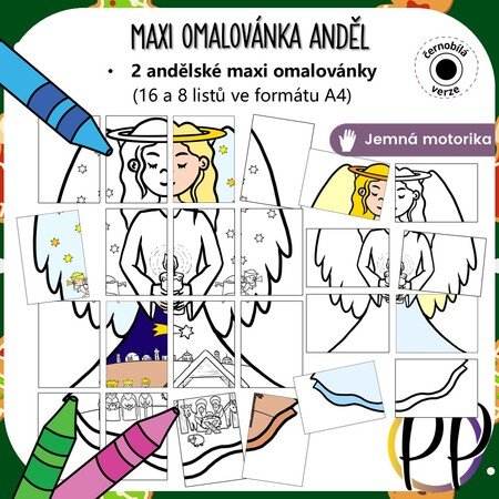 - 16 listů ve formátu A4 s motivem anděla s vnitřní omalovánkou betléma,