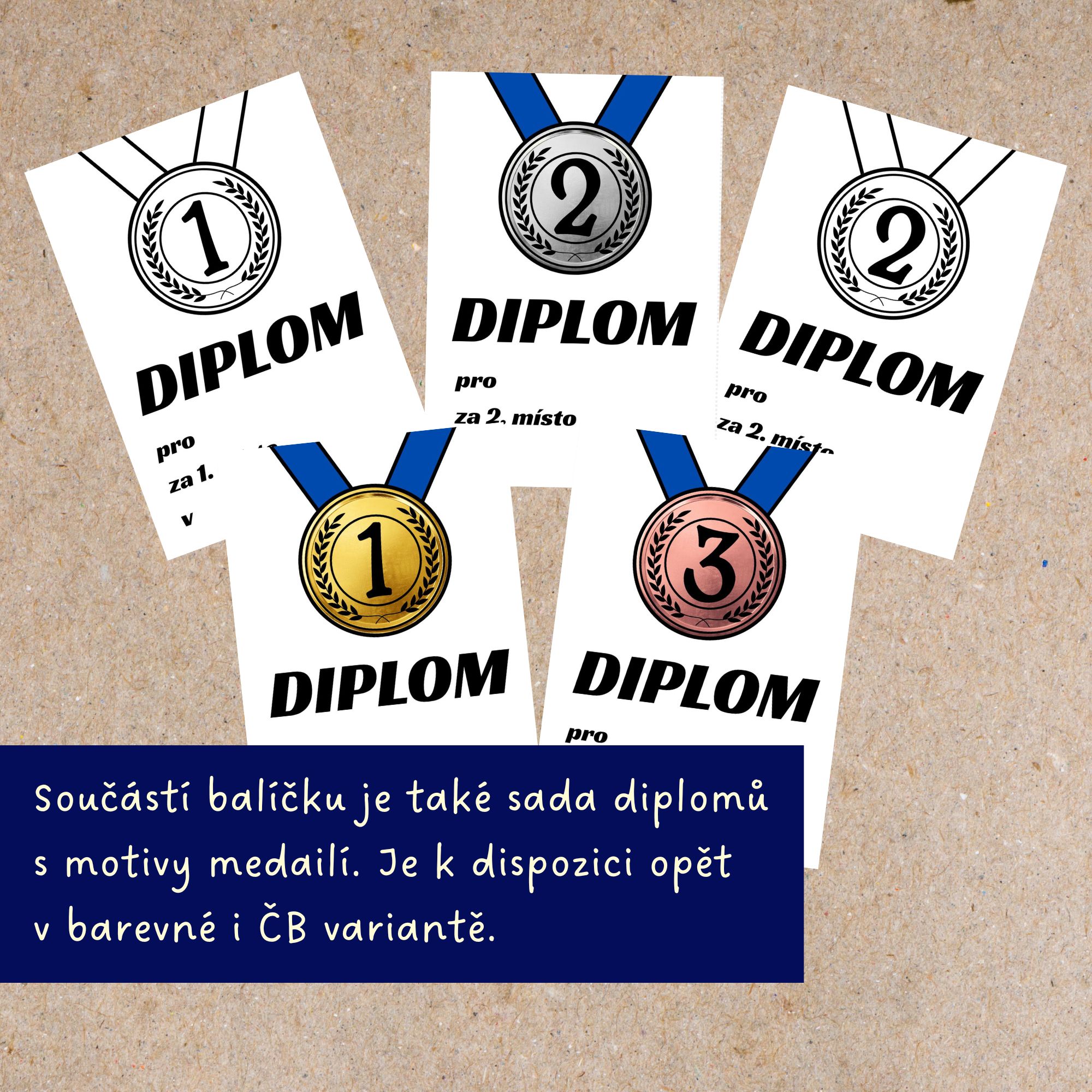 🏅Součástí souboru jsou podklady k výrobě vlastní zlaté, stříbrné a bronzové medaile v barevné i černobílé variantě, a dále rovněž diplomy s motivy medailí v obou verzích.