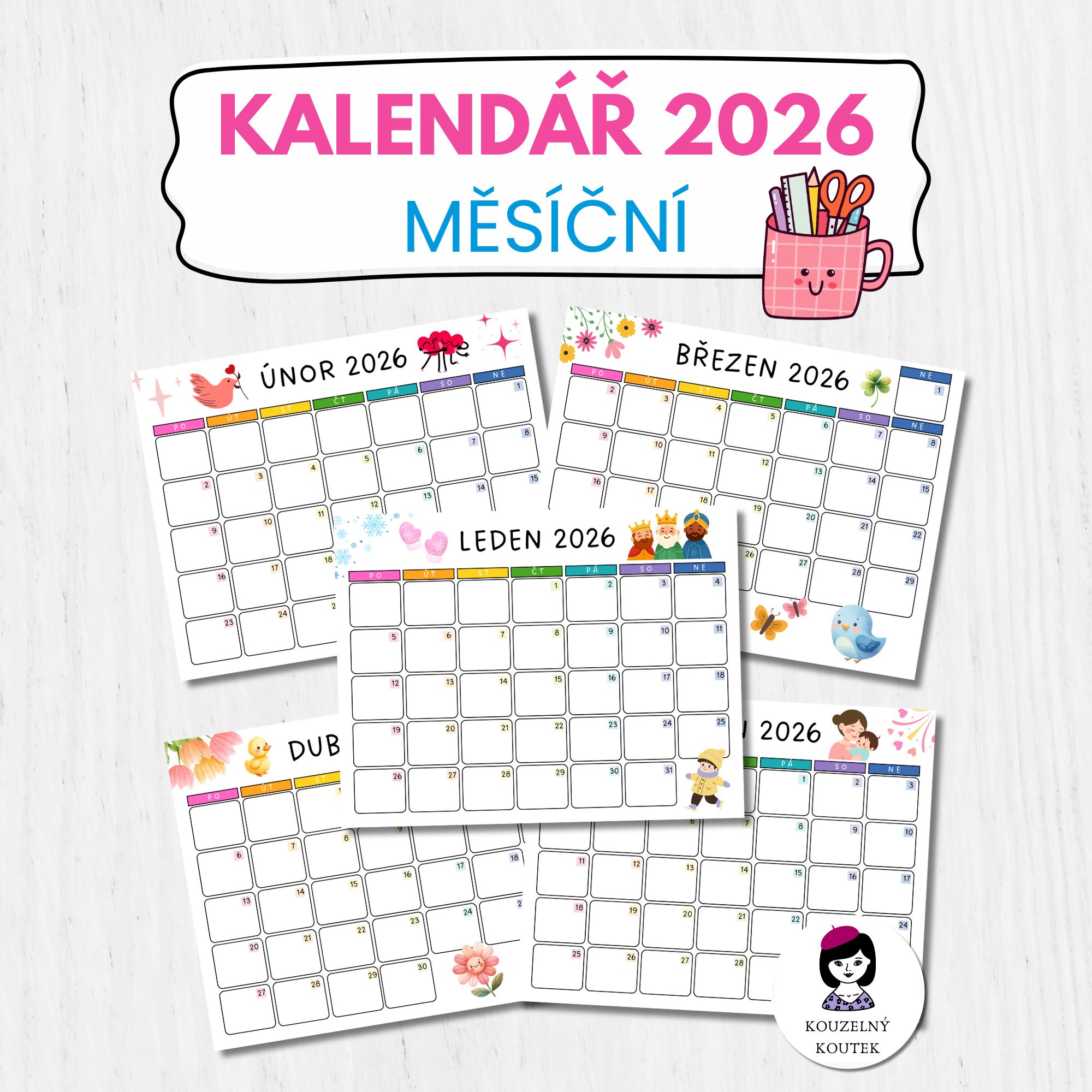 Tento měsíční kalendář ve formátu A4 je doplněn veselými ilustracemi, které rozzáří každou nástěnku nebo diář (pro formát A5 tiskněte 2 stránky na jeden list)