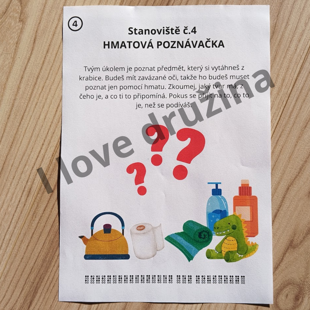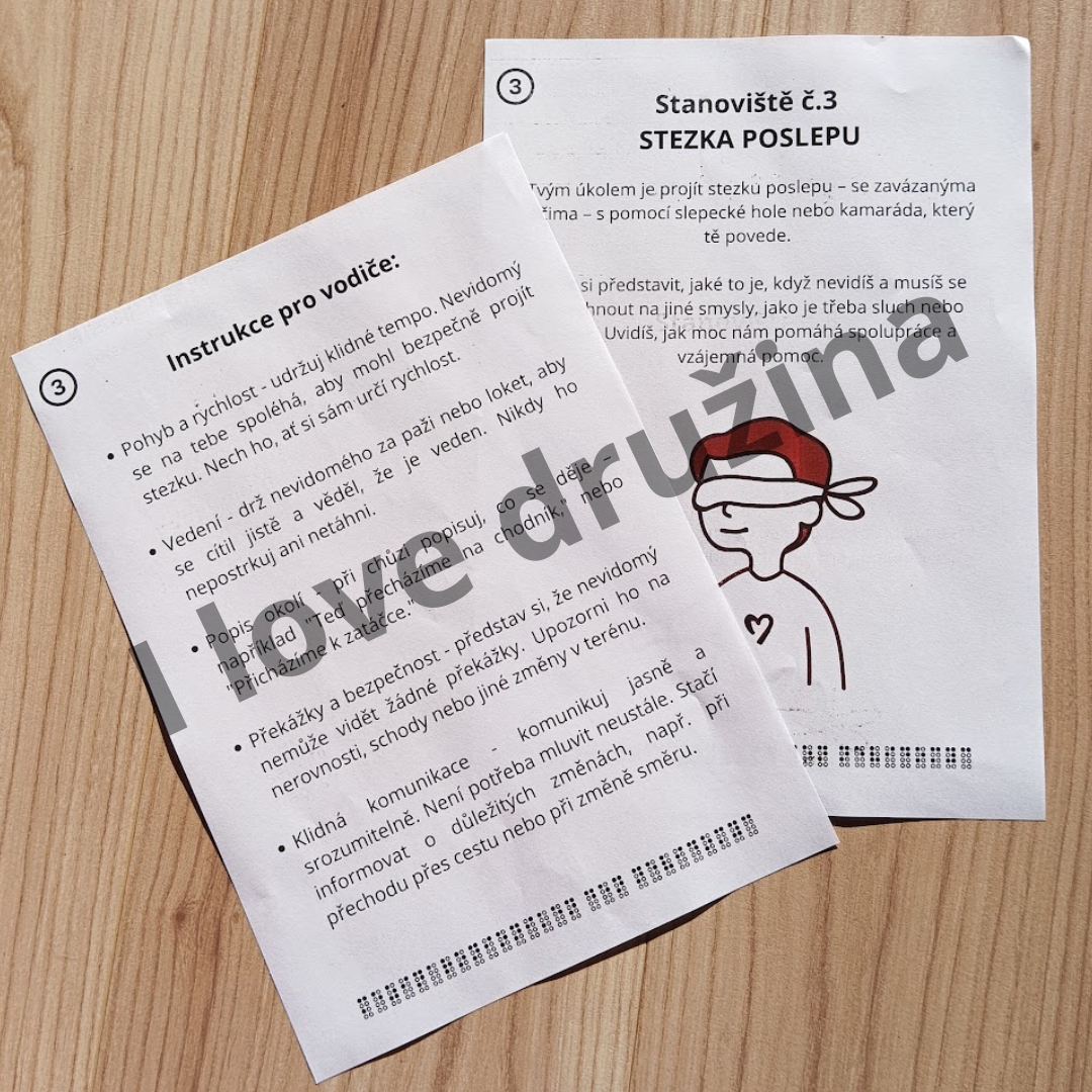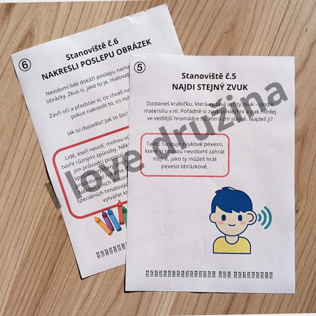 Materiál obsahuje celkem 7 stanovišť s různorodými aktivitami, jako jsou úkoly zaměřené na Braillovo písmo, rozpoznávání zvuků, hmatové hry a překážková dráha se zavázanýma očima. Tyto úkoly dávají dětem možnost prozkoumat a rozvíjet své smyslové dovednosti v praktických cvičeních a zažít si, jaké to je, pohybovat se ve světě bez našeho hlavního smyslu - zraku.
