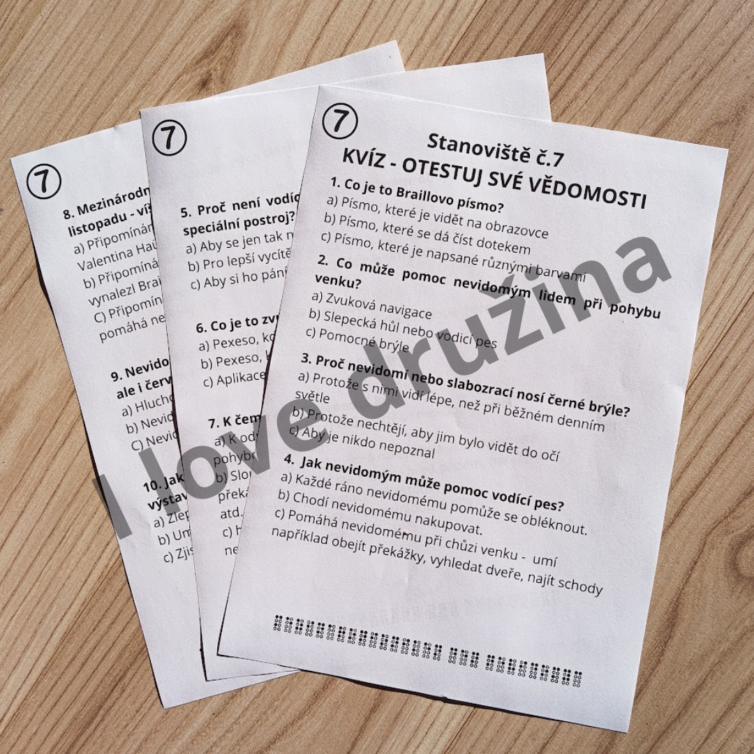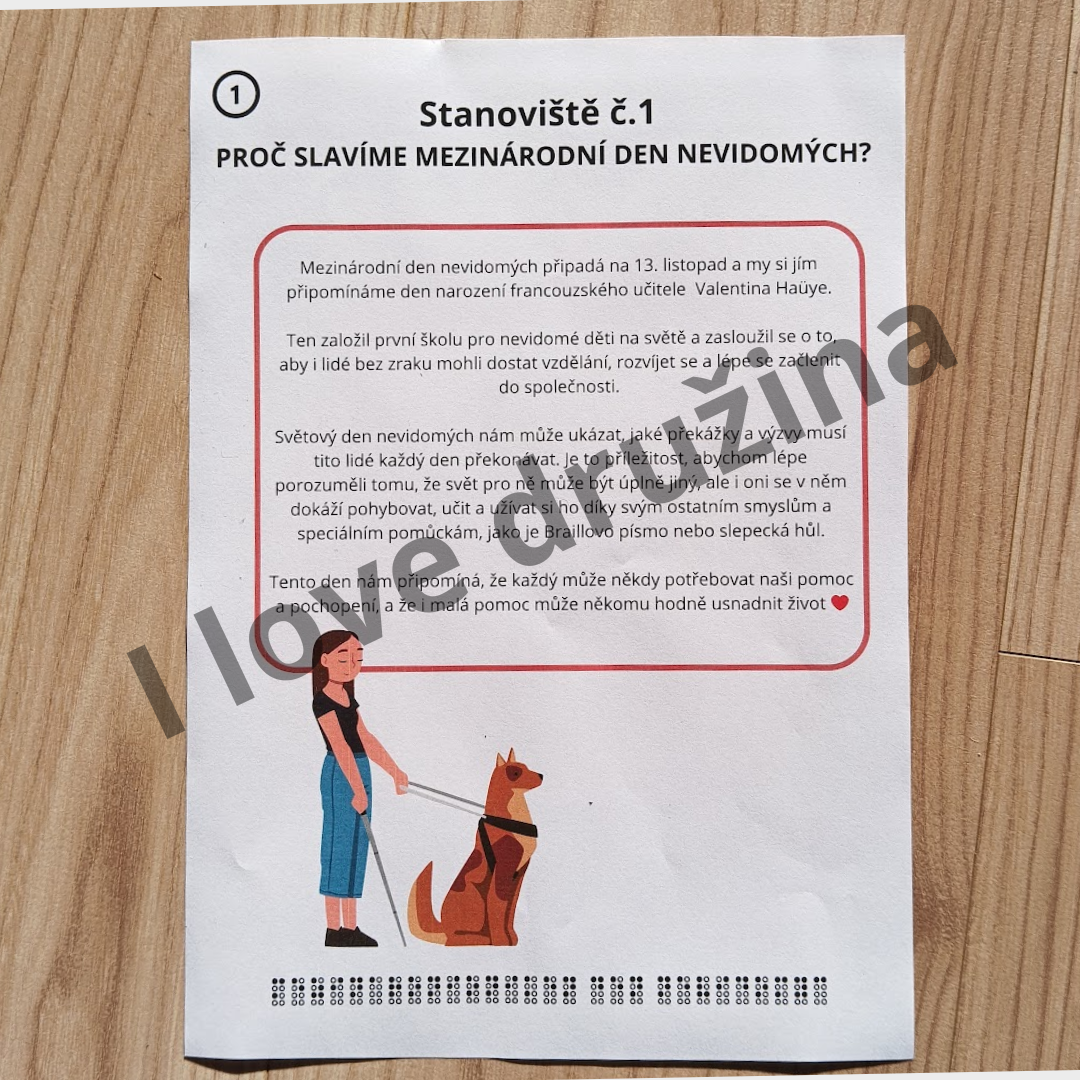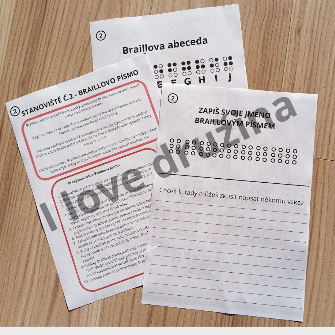 Materiál obsahuje celkem 7 stanovišť s různorodými aktivitami, jako jsou úkoly zaměřené na Braillovo písmo, rozpoznávání zvuků, hmatové hry a překážková dráha se zavázanýma očima. Tyto úkoly dávají dětem možnost prozkoumat a rozvíjet své smyslové dovednosti v praktických cvičeních a zažít si, jaké to je, pohybovat se ve světě bez našeho hlavního smyslu - zraku.