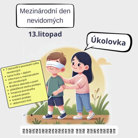 Materiál „Den nevidomých“ je připravený pro děti ve věku 6–10 let a slouží jako zážitková aktivita k oslavě mezinárodního dne nevidomých. Jeho cílem je hravou formou přiblížit život lidí s postižením zraku a podpořit rozvoj smyslového vnímání u dětí.