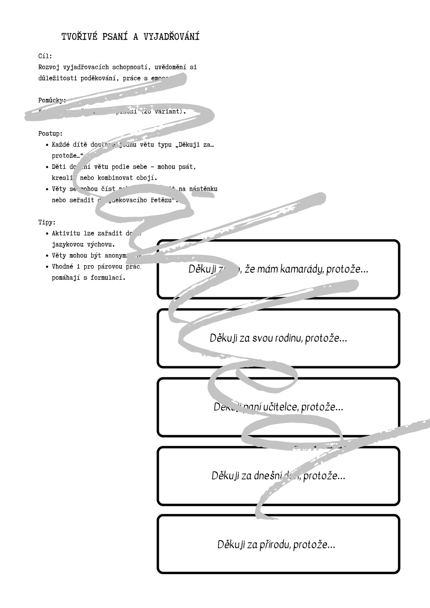 - Tvořivé psaní a vyjadřování – „Děkuji, protože…“ Děti doplňují věty vyjadřující vděčnost – jazyková aktivita s hlubším přesahem.