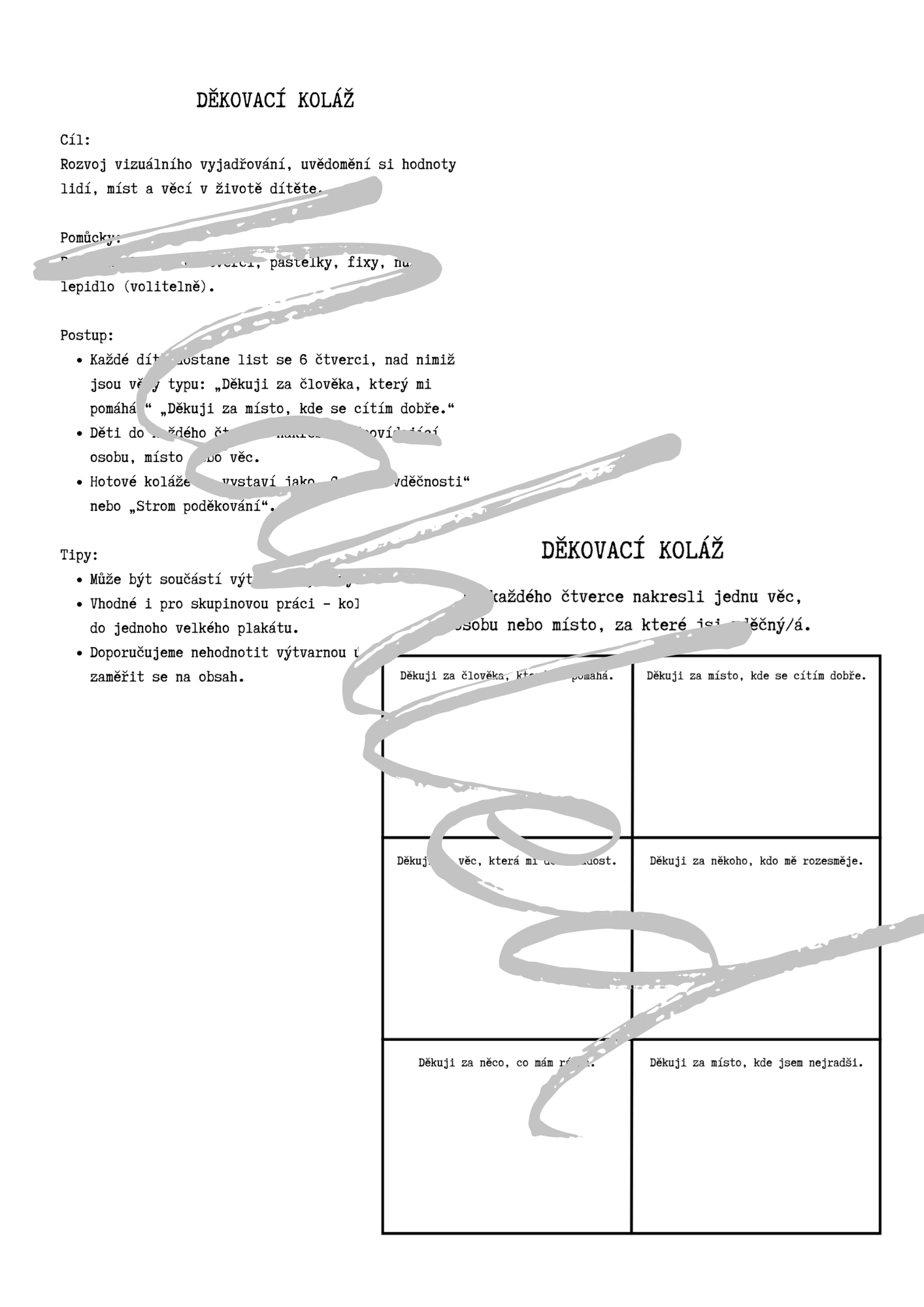 - Děkovací koláž – Pracovní list se 6 čtverci, do kterých děti kreslí osoby, místa nebo věci, za které jsou vděčné.