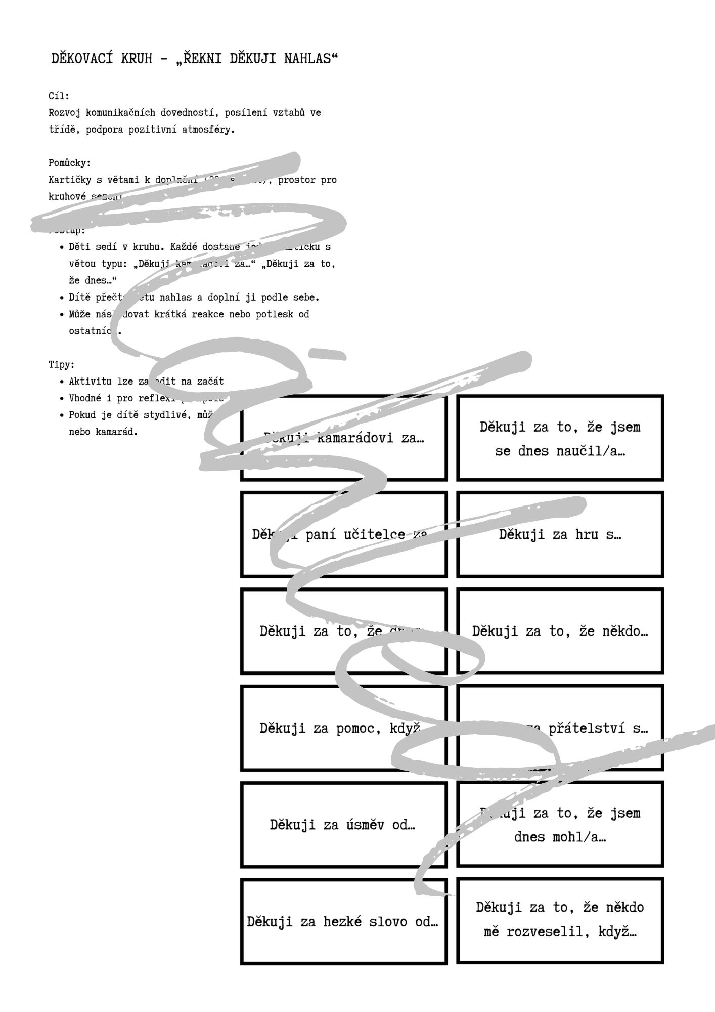- Děkovací kruh – „Řekni děkuji nahlas“ Společná aktivita v kruhu, kde děti sdílejí poděkování a posilují třídní komunitu.