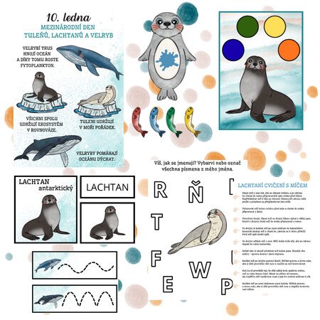Datum, základní informace a stručné zajímavosti o tom, proč jsou tuleni, lachtani a velryby pro oceán důležití. Ideální pro nástěnku nebo ranní kruh.