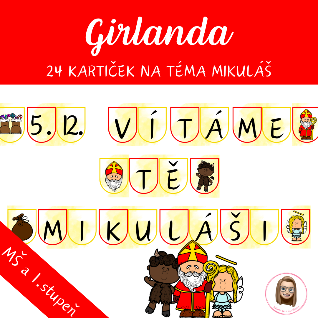 Ozdobte školu, třídu nebo vstupní prostor krásnou tematickou girlandou s nápisem „5. 12. VÍTÁME TĚ, MIKULÁŠI“. Soubor obsahuje celkem 24 kartiček, včetně obrázkových vlaječek – anděla, čerta, Mikuláše, nadílky i pytle – které dodají výzdobě hravý vzhled a slavnostní atmosféru.